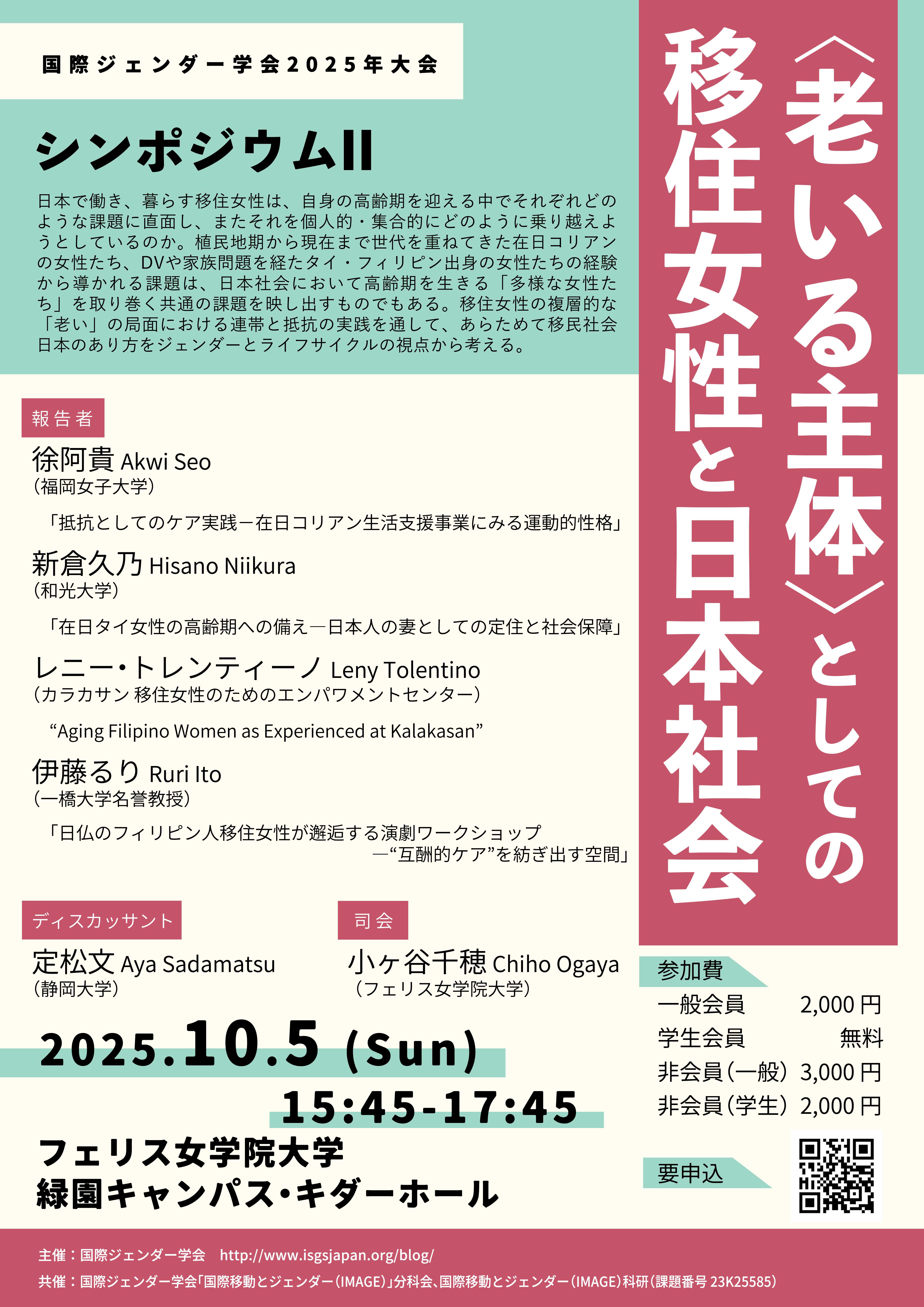 | 詳細: | 10月4日(土)、5日(日)に国際ジェンダー学会がフェリス女学院大学緑園キャンパスにて開催されます。 多種多様な個人報告や、じっくりと議論できるラウンドテーブルが例年通りおこなわれるほか、今年度は以下の二つのシンポジウムを開催予定です。 申込期限は9月20日となっております。みなさまのご参加をお待ちいたしております。 申込: https://peatix.com/event/4506647 ========== 〇「日本で考えるフェミニズムとコロニアリティ」(シンポジウムI) 日時:2025 年10月4 日(土)15:45-17:45 会場:フェリス女学院大学緑園キャンパス キダーホール 近年、日本を含め世界の多くの地域において、近代以降の世界において不可視化・抑圧されてきた立場/視角からの既存のフェミニズムに対しての異議申し立てや、それに基いた議論が再び活性化している。本シンポジウムでは、フェミニズムに内在する植民地性を現代的状況において考察する上で重要な概念の整理を共有したうえで、日本の文脈からフェミニズムと植民地性について改めて考えることを目的とする。日本という場において実践され・語られるフェミニズムと植民地性の現在に関する事例を共有することを通じて、日本におけるフェミニズムの脱植民地化(decolonizing)への方途を探りたい。 ・司会:土野瑞穂 (明星大学・会員) ・登壇者: 中村雪子(お茶の水女子大学・会員) 「趣旨説明」 李亜姣(宇都宮大学・会員) 「在日中国人フェミニストとアクティビズム」 鳥山純子(立命館大学・会員) 「『帝国』視点から考える第三世界フェミニズム――『イスラーム・ジェンダー学科研』を事例に」 瀬戸徐映里奈(近畿大学・非会員) 「食卓の向こうから部落フェミニズムを紡ぐ」 ・ディスカッサント: 金友子(立命館大学・非会員) ・主催:国際ジェンダー学会「開発とジェンダー」分科会 〇「<老いる主体>としての移住女性と日本社会」(シンポジウムII) 日時:2025 年10月5 日(日)15:45-17:45 会場:フェリス女学院大学緑園キャンパス キダーホール 日本社会における高齢化と移住者の関係は、しばしば移住ケア労働者への需要の高まりとして議論されてきた。また、ジェンダーの視点から高齢化をとらえようとするとき、高齢「日本人」単身女性の貧困化・孤立化などが問題視される一方で、ホスト社会を生産領域・再生産領域の両面で支え続けてきた移住女性の滞在の長期化や高齢化は、ほとんど注目されることはなく、不可視化されている。 本シンポジウムでは、日本で働き、暮らす移住女性が、自身の高齢期を迎える中でそれぞれどのような課題に直面し、またそれを個人的・集合的にどのように乗り越えようとしているのかを、実証研究および現場での実践から明らかにすることを目的とする。彼女たちの経験から導かれる課題と実践は、日本社会において高齢期を生きる「多様な女性たち」を取り巻く共通の課題を映し出すものでもある。植民地期から現在まで世代を重ねてきた在日コリアンの女性たちだけでなく、DVや家族問題を乗り越えてきたタイやフィリピン出身女性たちの中にも現在高齢期を迎えている人たちが増えている。 来日の経緯や移住のプロセス、コミュニティのあり方の相違は、こうした移住女性の複層的な「老い」の局面においてどのような課題とそれへの取組みを生み出しているのだろうか。また、高齢期を迎える彼女たちの間には、どのような連帯と抵抗の実践が生まれているのだろうか。 本シンポジウムを通して、あらためて移民社会日本のあり方をジェンダーとライフサイクルの視点から考え、「国際移動とジェンダー」という研究領域の深化も目指していきたい。 ・司会:小ヶ谷千穂(フェリス女学院大学・会員) ・登壇者: 徐阿貴(福岡女子大学・会員) 「抵抗としてのケア実践――在日コリアン生活支援事業にみる運動的性格」 新倉久乃(和光大学・会員) 「在日タイ女性の高齢期への備え――日本人の妻としての定住と社会保障」 レニー・トレンティーノ(カラカサン 移住女性のためのエンパワメントセンター・非会員) “Aging Filipino Women as Experienced at Kalakasan” 伊藤るり(一橋大学名誉教授・会員) 「日仏のフィリピン人移住女性が邂逅する演劇ワークショップ——“互酬的ケア”を紡ぎ出す空間」 ・ディスカッサント:定松文(静岡大学・会員) ・共催:国際ジェンダー学会「国際移動とジェンダー(IMAGE)」分科会、国際移動とジェンダー(IMAGE)科研(課題番号23K25585) =========== |
