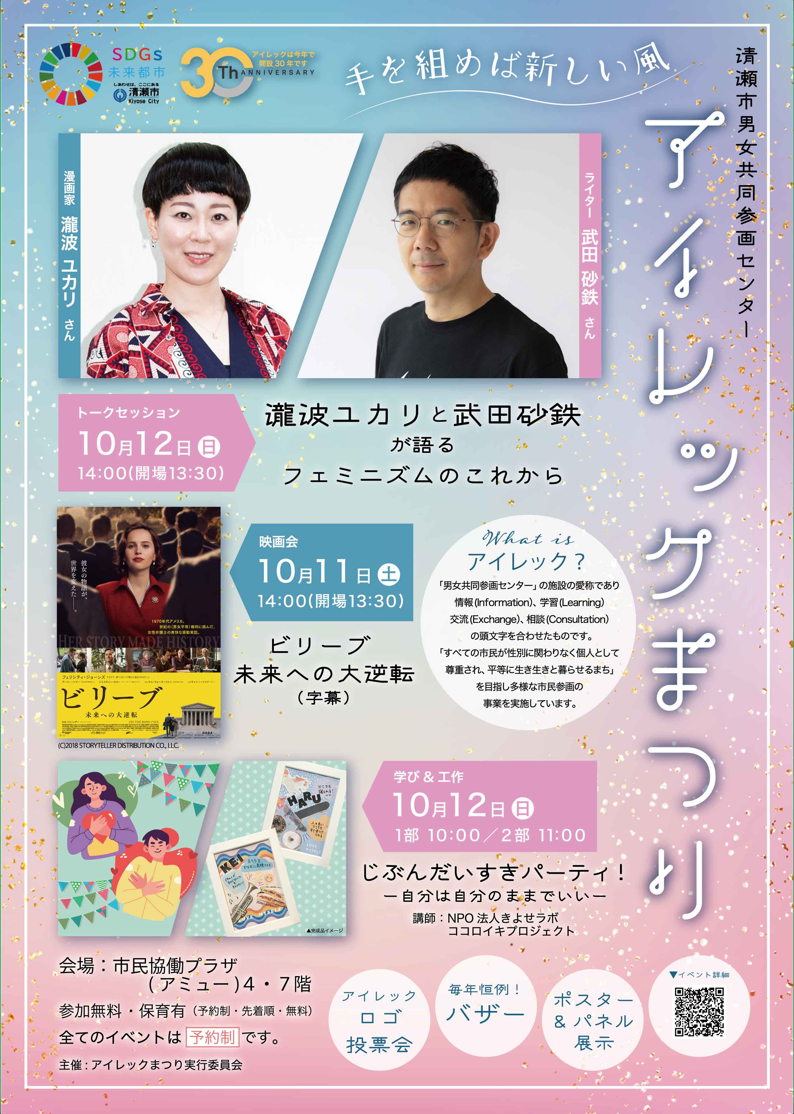 | 詳細: | 2025(第30回)アイレックまつりを開催します!! 平成7年10月に男女平等社会の実現の拠点として清瀬市男女共同参画センター(愛称:アイレック)が開設し、翌年よりアイレックまつりが開催されました。今年、30回目を迎えるアイレックまつりは、市民参画の実行委員会の企画で漫画家の瀧波ユカリさんとライターの武田砂鉄さんの対談をはじめ、様々なイベントを開催します。 【12日 トークセッション】 2025年10月12日(日曜日)午後2時~午後4時 講演者 漫画家:瀧波ユカリ、ライター:武田砂鉄 「瀧波ユカリと武田砂鉄が語る フェミニズムのこれから」を開催します。 https://www.city.kiyose.lg.jp/siseijouhou/danjosankaku/1002903/1014140.html 【12日 ワークショップ】 2025年10月12日(日曜日)午前10時~正午 講師 NPO法人きよせラボ ココロイキプロジェクト 「じぶんだいすきパーティ! 自分は自分のままでいい」 https://www.city.kiyose.lg.jp/siseijouhou/danjosankaku/1002903/1014141.html 【11日 映画上映会】 「ビリーブ 未来への大逆転」(字幕) 120分 2025年10月11日(土曜日) 午後2時~ https://www.city.kiyose.lg.jp/siseijouhou/danjosankaku/1002903/1014142.html 【バ ザ ー】 男女共同参画センター会議室(市民協働プラザ4階)では、実行委員、登録団体によるバザーを実施します。 【ポスター展示】 市内在住・在学の小学生を対象に募集した「男女共同参画ポスター」の優秀作品を展示します。12日のトークセッション企画前に、最優秀作品の授賞式を開催します。 【パネル展示】 アミューホール(市民協働プラザ7階)のロビーでは、男女共同参画センター(アイレック)の登録団体等の活動紹介パネルを展示します。 【アイレックロゴマーク投票会】 開設30周年を記念して市内在住、在学、在勤の若者(中学生以上25歳未満)から募集したアイレックのロゴマーク優秀作品の投票を実施します。各イベント参加者に投票していただきます。 ※トークセッション、ワークショップ、上映会は、いずれも事前申込み制(無料)です。 |