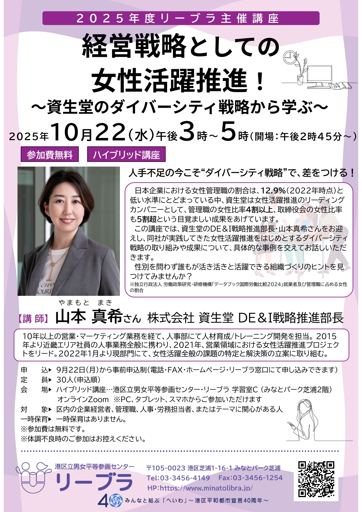 | 詳細: | 港区立男女平等参画センター(愛称:リーブラ)では、2025年10月22日(水)午後3時から主催講座「経営戦略としての女性活躍推進!~資生堂のダイバーシティ戦略から学ぶ~」を開催します。ハイブリッド開催方式の講座のため、会場、またはオンラインからご参加いただけます。参加は無料で、事前申し込み制となっております。下記、詳細となります。 《開催概要》 ■講座名:経営戦略としての女性活躍推進!~資生堂のダイバーシティ戦略から学ぶ~ ■講座内容: 人手不足の今こそ“ダイバーシティ戦略”で、差をつける! 日本企業における女性管理職の割合は、12.9%(2022年時点)と低い水準にとどまっている中、資生堂は女性活躍推進のリーディングカンパニーとして、管理職の女性比率4割以上、取締役会の女性比率も5割超という目覚ましい成果をあげています。 この講座では、資生堂のDE&I戦略推進部長・山本真希さんをお迎えし、同社が実践してきた女性活躍推進をはじめとするダイバーシティ戦略の取り組みや成果について、具体的な事例を交えてお話しいただきます。 性別を問わず誰もが活き活きと活躍できる組織づくりのヒントを見つけてみませんか? ※独立行政法人 労働政策研究・研修機構「データブック国際労働比較2024」就業者及び管理職に占める女性の割合 ■講師:山本真希(やまもと まき)さん 株式会社資生堂 DE&I戦略推進部長 10年以上の営業・マーケティング業務を経て、人事部にて人材育成/トレーニング開発を担当。 2015年より近畿エリア社員の人事業務全般に携わり、2021年、営業領域における女性活躍推進プロジェクトをリード。 2022年1月より現部門にて、女性活躍全般の課題の特定と解決策の立案に取り組む ■日程:2025年10月22日(水)午後3時~5時(開場:午後2時45分~) ■会場:ハイブリッド開催 対面:港区立男女平等参画センター・リーブラ 学習室C オンライン:Zoom ■費用・定員:無料(事前お申し込み制)・30名(申し込み順) ■対象:区内の企業経営者、管理職、人事・労務担当者、またはテーマに関心がある人 ■申込:会場参加をご希望の方は、こちらの申込フォーム(https://www.minatolibra.jp/event/apply/?post_id=15232)から、 オンライン参加をご希望の方は、こちらの申込フォーム(https://www.minatolibra.jp/event/apply_on-line/?post_id=15232)からお申込みください。 |