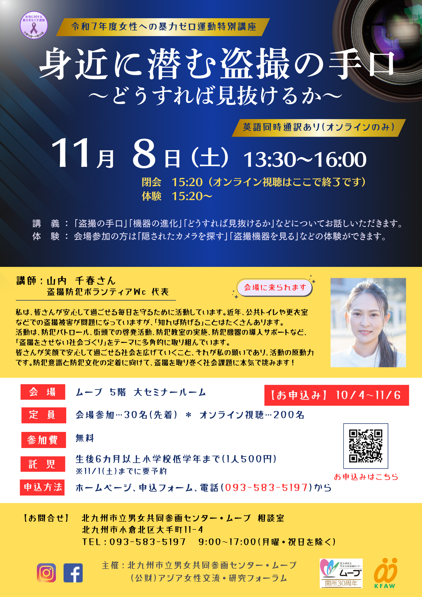 | 詳細: | 11月は内閣府が実施する「女性に対する暴力をなくす運動」期間があり、国連がキャンペーンする「女性に対する暴力撤廃の国際デー」があります。 報道などで毎日のように耳にする「盗撮」は、年齢性別に関係なく誰もが被害に遭う可能性のあるとても身近な「犯罪」であり、「性暴力」です。子どもを標的にした卑劣な犯罪も増えています。 日本では、2023年に「性的姿態等撮影罪(撮影罪)」が新たに施行され、盗撮行為の検挙数はすこしずつ増えています。テクノロジーの進化により「盗撮」はいまや世界中の課題となっていますが、法整備が進まない国がほとんどです。 また盗撮被害はデジタルタトゥーとも呼ばれ、オンラインで共有された画像や映像は二度と消せないとも言われています。盗撮ビジネス市場は巨大で今や世界的な規模を誇っています。 セミナーは「盗撮をさせない社会づくり」に取り組む講師にお話を伺い、盗撮の「最新の手口」「機器の進化」「どうすれば見抜けるか」などについて学びます。 世界共通の深刻な問題である「盗撮」に対する「知れば防げる」知識と意識を高めましょう。本セミナーの拡散・転送は大歓迎です。 日時:11月8日(土) 13:30~15:20(オンライン) ◆英語同時通訳あり(オンライン視聴のみ) ※会場参加の方は、盗撮カメラを探す体験ができます。 (体験 15:20~16:00)(会場参加の方のみ) 会場:北九州市立男女共同参画センター・ムーブ(福岡県北九州市小倉北区) 【講師】盗撮防犯Wc 代表:山内 千春 さん https://npo-wc.org/ 【申し込み】お申し込み期間は10/4~11/6まで、以下のURLからお申し込みください。 https://forms.gle/XEzj7rXeKxV5yRZ8A |
