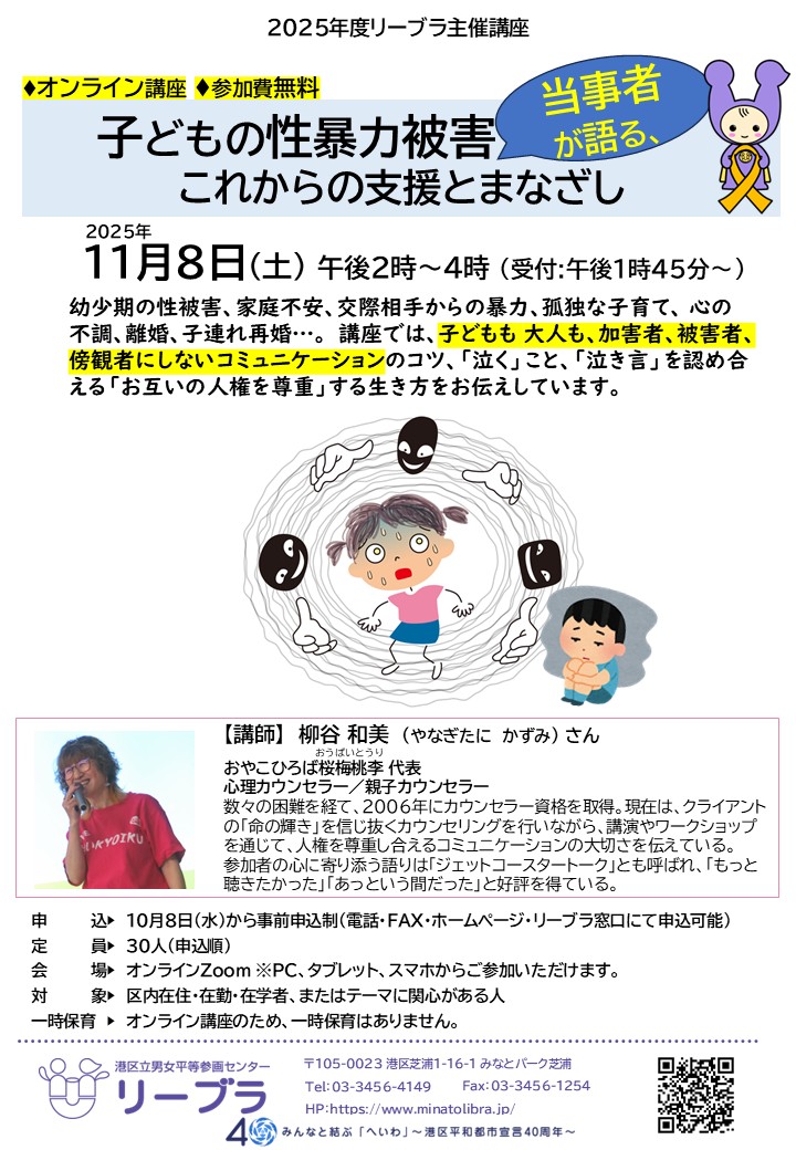 | 詳細: | オンライン講座 / 参加費無料 子どもの性暴力被害当事者が語る、これからの支援とまなざし 2025年11月8日(土)午後2時~4時 (開場:午後1時45分から) 幼少期の性被害、家庭不安、交際相手からの暴力、孤独な子育て、心の不調、離婚、子連れ再婚…。講座では、子どもも大人も、加害者、被害者、傍観者にしないコミュニケーションのコツ、「泣く」こと、「泣き言」を認め合える「お互いの人権を尊重」する生き方をお伝えしています。 【講師】柳谷 和美(やなぎたに かずみ) さん おやこひろば桜梅桃李 代表 心理カウンセラー/親子カウンセラー 数々の困難を経て、2006年にカウンセラー資格を取得。現在は、クライアントの「命の輝き」を信じ抜くカウンセリングを行いながら、講演やワークショップを通じて、人権を尊重し合えるコミュニケーションの大切さを伝えている。参加者の心に寄り添う語りは「ジェットコースタートーク」とも呼ばれ、「もっと聴きたかった」「あっという間だった!」と好評を得ている。 開 催 日:2025年11月8日(土)午後2時~4時(開場:午後1時45分~) 申 込:2025年10月8日(水)より、電話・FAX・ホームページ・リーブラ窓口にて申し込みできます。 申込締切:定員に達し次第、申し込み受付終了 会 場:オンライン(Zoom) 対 象:区内在住・在勤・在学者またはテーマに関心のある人 定 員:30人 参 加 費:無料 保 育:オンライン講座のため、一時保育はありません。 |