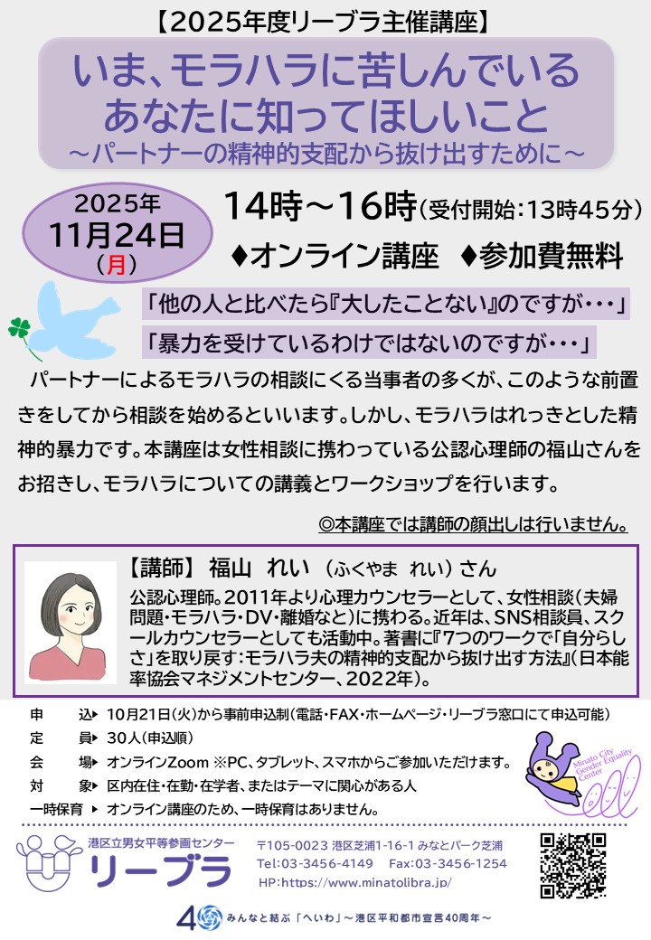 | 詳細: | 港区立男女平等参画センター(愛称:リーブラ)では、2025年11月24日(月)午後2時から主催講座「いま、モラハラに苦しんでいる あなたに知ってほしいこと ~パートナーの精神的支配から抜け出すために~」を開催します。参加は無料で、事前申し込み制となっております。下記、詳細となります。 <開催概要> ■講座名称:いま、モラハラに苦しんでいる あなたに知ってほしいこと ~パートナーの精神的支配から抜け出すために~ ■講座概要:「他の人と比べたら『大したことない』のですが・・・」「暴力を受けているわけではないのですが・・・」。パートナーによるモラハラの相談にくる当事者の多くが、このような前置きをしてから相談を始めるといいます。しかし、モラハラはれっきとした精神的暴力です。本講座は女性相談に携わっている公認心理師の福山さんをお招きし、モラハラについての講義とワークショップを行います。 ■講師:福山 れい さん・・・公認心理師。2011年より心理カウンセラーとして、女性相談(夫婦問題・モラハラ・DV・離婚など)に携わる。近年は、SNS相談員、スクールカウンセラーとしても活動中。著書に『7つのワークで「自分らしさ」を取り戻す:モラハラ夫の精神的支配から抜け出す方法』(日本能率協会マネジメントセンター、2022年)。 ※本講座では講師の顔出しは行いません。 ■日程:2025年11月24日(月)午後2時~4時(開場:午後1時45分) ■会場:オンライン開催(zoom) ■費用・定員:無料(事前申し込み制)・30名(申し込み順) ■対象:区内在住・在勤・在学者またはテーマに関心がある人 ■申込:「講座・イベント申込フォーム」(https://www.minatolibra.jp/event/apply_on-line/?post_id=15510)からお申込みください。 ■諸注意 ※講座前日までに、受講者に受講方法等をメールでご案内いたします。メールアドレスの入力間違いが多くなっております。お申込みの際、今一度お確かめの上、送信してください。 ※no-reply@minatolibra.jpからのメールを受信できるよう、設定をご確認ください。 ※個人情報の取り扱いについて ・ご提供いただいた個人情報は、お申し込みの講座の運営およびそれに関わるご連絡以外の目的には使用しません。 ・また本人の同意なく第三者へ提供することはありません。 ※オンライン受講にあたって ・リーブラオンライン講座では、セキュリティのために待機室を使用しており、参加者の入室を制限しています。参加者は「Zoom表示名」と「申込み時の名前」が一致している場合にのみ講座へ入室できます。(講座入室後はご自身で表示名のご変更は可能)必ず事前に、Zoomにアクセスいただき、表示名の確認・変更をお願いします。また、最初からZoom表示名を申込み名と異なるものにしたい場合も、事前に講座担当者にご連絡ください。進行中もチャットで申込み名の確認を行うことがあり、確認が取れない場合は待機室に戻っていただきます。安全・安心な講座運営にご協力をお願いします。 ・初めてZoomを使う方は、講座前にアプリのダウンロードなどの準備ならびに動作確認をお願いします。講座当日のテクニカルサポート(Zoomの不具合や操作など)には、ご対応しかねますので予めご了承ください。 是非、この機会にリーブラにお越しいただき、ジェンダー平等、男女平等参画社会についての意識・知識を高めていただければ幸いです。 |