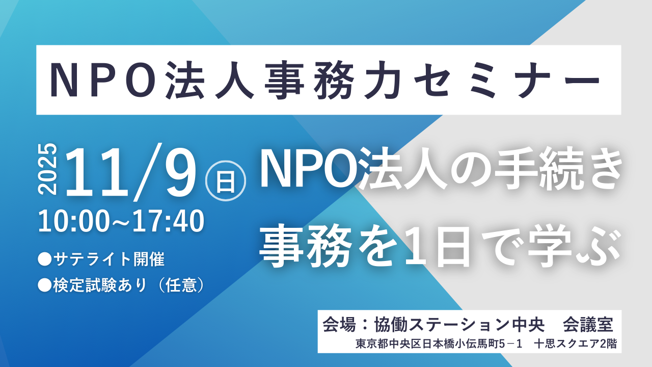 | 詳細: | ━━━━━━━━━━━━━━━━━━ NPO法人の手続き・事務を1日で学ぶ 「NPO法人事務力」セミナー(検定試験あり) ▼お申し込みと詳細はこちらから▼ https://npo-sc.org/training/good-business-studio/curriculum/25013/ ━━━━━━━━━━━━━━━━━━ どのNPO法人の運営にも共通して必要な事務作業「事務局業務」。 事務局に求められる業務は多岐にわたり、常に事業も忙しく、毎回なんとなくで済ませていないでしょうか。 多岐にわたる事務局業務の理解と実行力を伸ばすことは、事務局長や担当者自身の安心だけでなく、団体の信頼性を高めることにつながります。 「適切に運営できているだろうか?」という不安な気持ちの解消を目指して、是非この機会に、事務局業務の全体像を一緒に確認していきましょう! 【当日のタイムスケジュール】 ・10:00-15:45 NPO法人事務力セミナー(休憩時間:11:30-12:30、14:00-14:15) ・16:00-17:00 NPO法人事務力検定(入門手続編)※任意参加 ・17:00-17:40 検定解説 ※任意参加 【プログラム内容】 (1)NPO事務局基礎 ・NPO法人の制度、法人運営業務の全体像、定款など。 ・実態調査によると、多くの団体が定款に沿った運営ができておらず、定款違反の状態です。この機会に定款をチェックし適切な運営を目指しましょう。 (2)所轄庁手続 ・情報開示事務、事業終了後手続き、役員変更、定款変更手続きなど。 ・毎年の報告から各種変更の手続きを確認します。いざという時に慌てないよう把握できます。 (3)法務局手続 ・登記の手続き、役員変更手続き、登記事項証明書の読み方など。 ・意外と忘れてしまいがちな、法務局手続きを把握できます。 (4)会議の運営 ・総会、理事会の要件、招集・議事録作成の手続きなど。 ・実は注意しないといけないポイントが多い、総会・理事会運営。自信を持った適切な運営を目指しましょう。 (5)会計実務 ・NPO法人会計基準、現金や通帳の管理、現金出納帳、勘定科目、仕訳、月締め、各種台帳など。 ・NPO法人に求められる会計実務の概要を確認します。 (6)労務管理 ・就業規則、雇用時の手続き、日々の手続き、退職時の手続き、社会保険など。 ・有給スタッフがいる団体はもちろん、これから採用を検討している団体も各種手続きを把握しましょう。 【検定内容(任意受検)】 ▼概要 : NPO法人に必要な事務局業務全般について、その理解度を問う日本で唯一の検定で、2013年より全国各地で実施されています。(原則として個人を対象としています。) ・スタッフの事務能力向上と、「事務ができている」状況の明確化を図ることで、事務を担当される方、団体に関わる方へ安心と信頼を提供します。 ・検定の合格者が所属する団体は、CANPANサイトへの掲載や助成金申請等の際に記載することができます。 ・今回は「入門手続編」の試験です。 ・試験方式は、多肢選択式です。 【日時】 11月9日(日)10:00-17:40 【実施体制】 ・主催:全国事務支援カンファレンス(https://npo-office-support.jp/) ・協力:NPOサポートセンター 【講師】 鍋嶋 洋子(サテライト) (認定特定非営利活動法人ちば・市民活動市民事業サポートクラブ 専務理事・事務局長) プロフィール 認定特定非営利活動法人ちば市民活動・市民事業サポートクラブ(NPOクラブ)専務理事・事務局長 1956年新潟生まれ。子育て中に生活クラブ生協の活動に出会い、生協役員を経てNPOクラブの設立に関わる。専従職員として18年間活動を継続、NPO法人をはじめとする地域づくり団体の活動支援を行ってきました。好きな言葉は一期一会。 福井 郁子(サテライト) (NPO法人北海道NPOサポートセンター) プロフィール 北海道小樽市出身。結婚を期に全国各地の様々な企業で経理事務に携わる。2016年9月よりNPO法人北海道NPOサポートセンターで、会計支援業務を担当。道内各地のNPO法人の会計サポート業務を受託。 高取 洋介(サテライト) (NPO法人佐賀県CSO推進機構) プロフィール 社会保険労務士として、労務相談、就業規則作成、社会保険手続き、助成金、個別労働紛争対応、ハラスメント対応、その他各種研修など「組織」「人」に関する様々な支援を行っている。NPO(中間支援組織)運営にも理事として10年以上の関与経験がある。 松浦 亮輔:会場コーディネーター (NPOサポートセンター) プロフィール 民間企業にてシステム開発に従事。その後公益社団法人アムネスティ・インターナショナル日本にてキャンペーン担当、 NPO法人監獄人権センターにて事業実施及び会計を含む事務全般、NPO法人日本ボランティアコーディネーター協会にて 事業担当のほか、支援者情報管理システムの導入・運用を担当。 NPOサポートセンター入職後は、様々な分野の非営利組織の会計、支援者管理、総会運営等のバックオフィスサポートを担当中。 NPO事務支援カンファレンス認定講師、准認定ファンドレイザー。 【対象】 ・設立から約2年以内のNPO法人の事務局長、事務局スタッフ、管理部門担当者 ・新たに、事務の担当になった方、スタッフになった方 ・NPO支援組