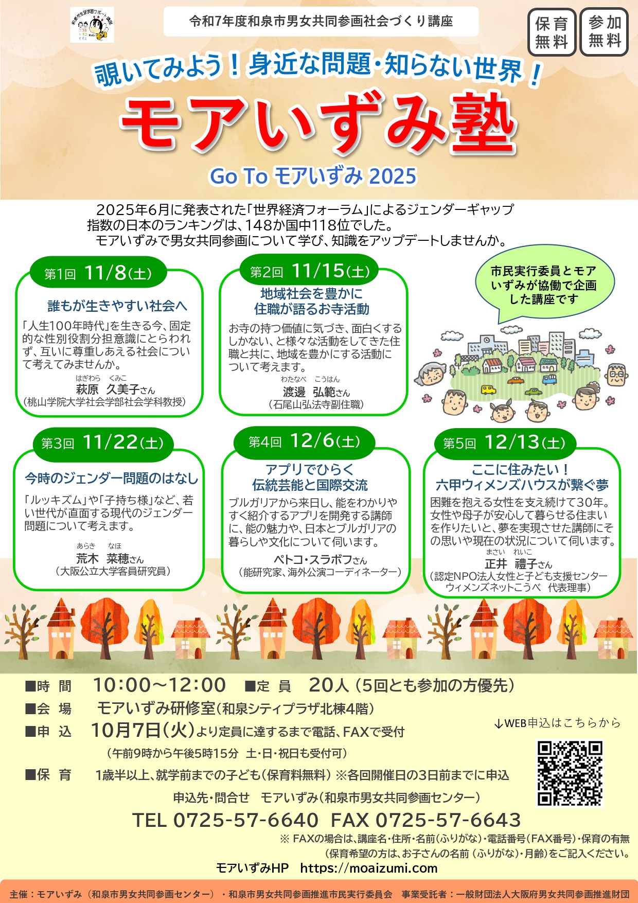 | 詳細: | モアいずみ塾『Go To モアいずみ 2025』 覗いてみよう!身近な問題・知らない世界!(連続5回) 2025年6月に発表された「世界経済フォーラム」によるジェンダーギャップ指数の日本のランキングは、148か国中118位でした。 モアいずみで男女共同参画について学び、知識をアップデートしませんか。 1回目 11/8(土)午前10時~正午 誰もが生きやすい社会へ 「人生100年時代」「少子高齢化の時代」の今を生きていくために男女共同参画について学び、従来の固定的な性別役割分担意識を変革し、互いに尊重しあえる社会について考える。 2回目 11/15(土)午前10時~正午 ●地域社会を豊かに 住職が語るお寺活動 お寺の持つ価値に気づき、面白くするしかない、と様々な活動をしてきた住職と共に、地域を豊にする活動について考える。 3回目 11/22(土)午前10時~正午 ●今時のジェンダー問題のはなし 「ルッキズム」や「子持ち様」など、若い世代が直面する現代のジェンダー問題について考える。 4回目 12/6(土)午前10時~正午 ●アプリでひらく 伝統芸能と国際交流 ブルガリアから来日し、能をわかりやすく紹介するアプリを開発する講師に、能の魅力や、日本とブルガリアの暮らしや文化について伺う。 5回目 12/13(土)午前10時~正午 ●ここに住みたい! 六甲ウィメンズハウスが繋ぐ夢 困難を抱える女性を支え続けて30年。女性や母子が安心して暮らせる住まいを作りたいと、10年来の夢を実現させた講師にその思いや経緯、現在の状況について伺う。 |