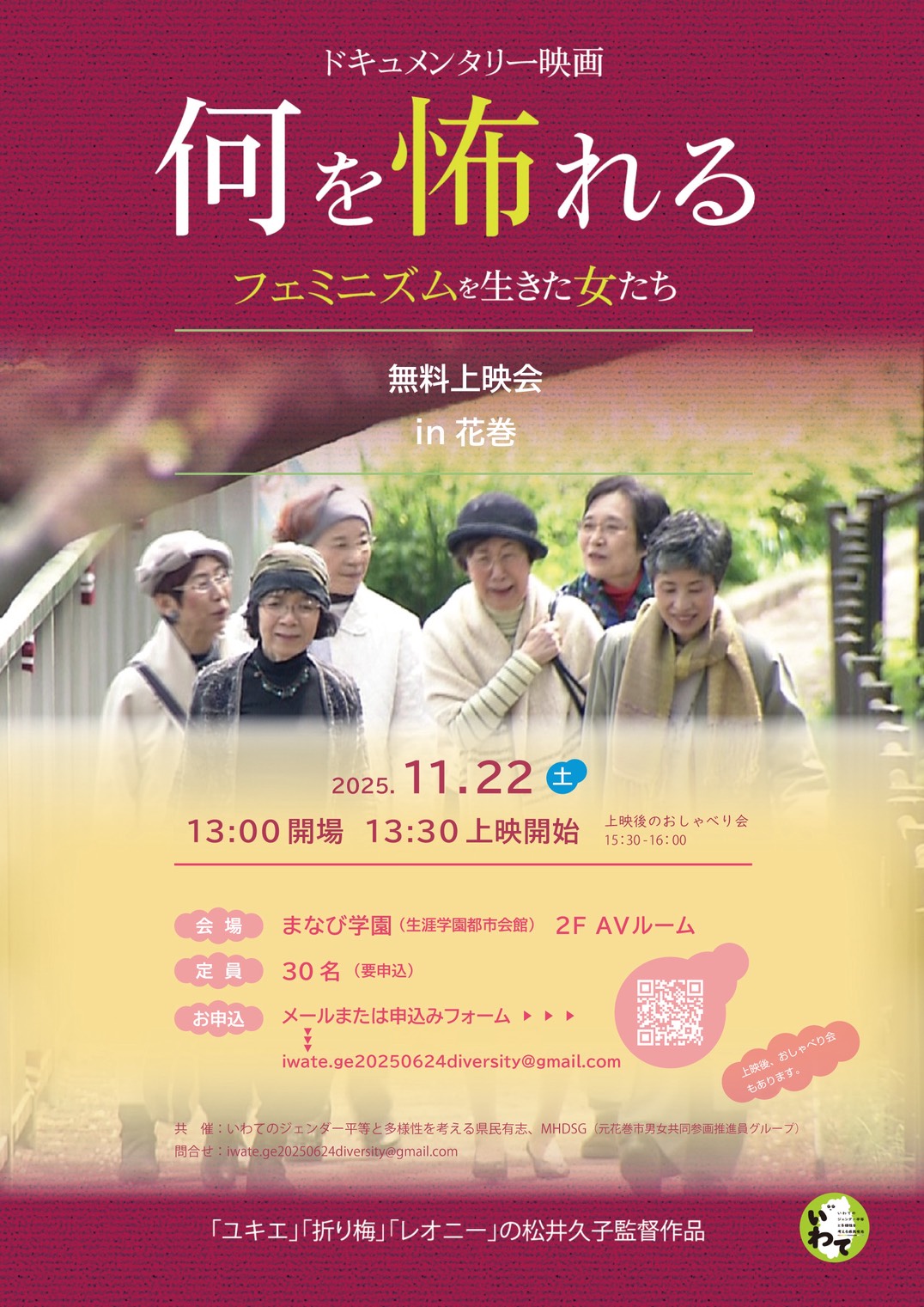 | 詳細: | 「もちよりジェンダーcafe」11月公開イベント ドキュメンタリー映画「何を怖れる」-フェミニズムを生きた女性たち 無料上映会in花巻を開催します。 ★ドキュメンタリー映画「何を怖れる」は、松井久子監督が「自分の人生を自分の 意思で選びとろうとした女性たち」に焦点をあてた作品です。 映画初上映から10年が経過した、この秋、岩手で上映会を開催します。 社会の中で「女性らしさ」という枠を超えて生きてきた人びとの言葉には、 時代を超えて響く力があります。 上映後、映画の感想などをもちよるおしゃべりタイムを予定しています。 皆さまのご参加をお待ちしております。 日時:2025年11月22日(土)13:30~16:00 会場:花巻市まなび学園(生涯学園都市会館)2階AVルーム (岩手県花巻市花城町1-47 電話0198-23-4234) 定員:30名 日程:13:00開場 13:30上映 15:30おしゃべり会(感想などもちよりのジェンダーcafe、聞き役も歓迎です) お申込:メール又は申込フォーム iwate.ge20250624diversity@gmail.com お問合せ:iwate.ge20250624diversity@gmail.com |