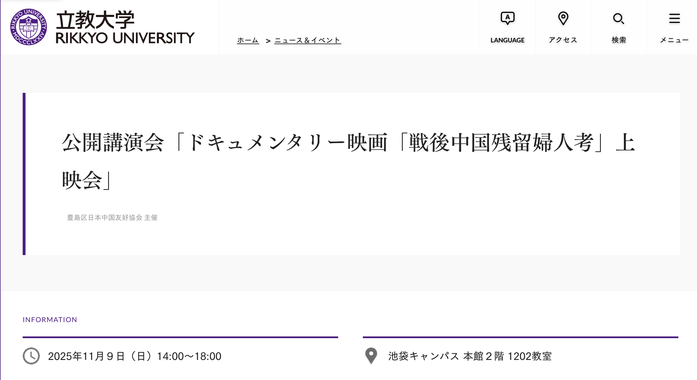 | 詳細: | 1972年日中国交正常化後始まった残留邦人帰国支援政策、当時の日本政府によって、1945年8月15日日本の敗戦当時、身元が分かっていた邦人のうち満13歳以上の女性は自らの意思で中国に残った「残留婦人」とされ、12歳以下の残留孤児と区別された。このドキュメンタリー映画は日本人留学生小林千恵さんの視点から、歴史研究を始め、敗戦後から未だ中国に滞在する「残留婦人」、及び家族を連れ日本に帰国した「残留婦人」たちを訪ね、特殊な時代、特殊な運命を生きた、特殊な人々の今を追い、考察するドキュメンタリー作品である。戦後80周年を記念し、戦争の悲惨さと平和の尊さを知ってもらう草の根活動として、日本国内約10か所における上映を進めている。 本上映会では本作を上映するとともに、本作の監督である王乃真氏(Wan Naizhen:北京電影学院教授)を招き、本作品制作の経緯や作品に込めたメッセージ等について講演していただく。また、西園寺一晃氏(公益社団法人日本中国友好協会顧問、東日本国際大学客員教授)から本作品の上映活動が目指すところやその意義について話していただく。 対象者 立教大学学生、教職員、校友、一般 申し込み 事前申し込み 不要 参加費 無料 主催:豊島区日本中国友好協会 共催:ジェンダーフォーラム、社会学部 |