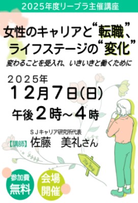 | 詳細: | ◇◆◇女性のキャリアと“転職”、ライフステージの“変化”~変わることを受入れ、いきいきと働くために~◇◆◇ *参加費 無料* *会場開催* ●日時:2025年12月7日(日)14:00~16:00 ーーーーーーーーーーーーーーーーーーーーーーーーーーー キャリアの“転機”と上手に向き合うヒントを 人生100年時代—―働く期間も長くなり、心身の健康、自分の生活を大切にしながら、仕事と付き合うことが求められています。キャリアアップや生活スタイルの変化に合わせ“転職すること”は、今や誰にも身近なことだと思われます。本講座では、特に妊娠・出産、子育て、介護などライフステージの変化で「仕事を続ける、辞める、変える」といった選択を迫られることが多い「女性」のキャリアに焦点をあて、働き方の「変化」とのつき合い方を学びます。 ーーーーーーーーーーーーーーーーーーーーーーーーーーー ◦申込:事前申込制(電話・FAX・HP・リーブラ窓口にてお申込みできます) ◦定員:30名(申込順) ◦会場:港区立男女平等参画センター 学習室C ◦対象:港区在住・在勤・在学者、またはテーマに関心がある人 *転職を考えていなくても、どなたでも受講できます。 ◦一時保育:対象…4か月~就学前(定員あり・申込順)。11月20日(木)までに要予約。 ーーーーーーーーーーーーーーーーーーーーーーーーーーー 【講師】佐藤 美礼(さとう みゆき)さん SJキャリア研究所代表 国家検定1級キャリアコンサルティング技能士 (公財)日本女性学習財団キャリア支援デザイナー 中央労働災害防止協会心理相談員 法政大学大学院修了(キャリアデザイン学修士)。大手企業の人材コーディネーター、人事・経営企画・国際戦略マネージャー職を経て官公庁へ入庁。男女共同参画審議会、ハラスメント防止、DE&I、働きやすい職場づくり等の行政施策を担当。現在は大学等で教鞭を執るほか、キャリアとメンタルヘルスを両輪で支援する専門家として研修コンサルティングを展開。ILOが提唱するジャストトランジション、サステナブル社会への貢献をめざすグリーンガイダンスのほか、企業におけるウェルビーイング経営の支援にも取り組んでいる。 |