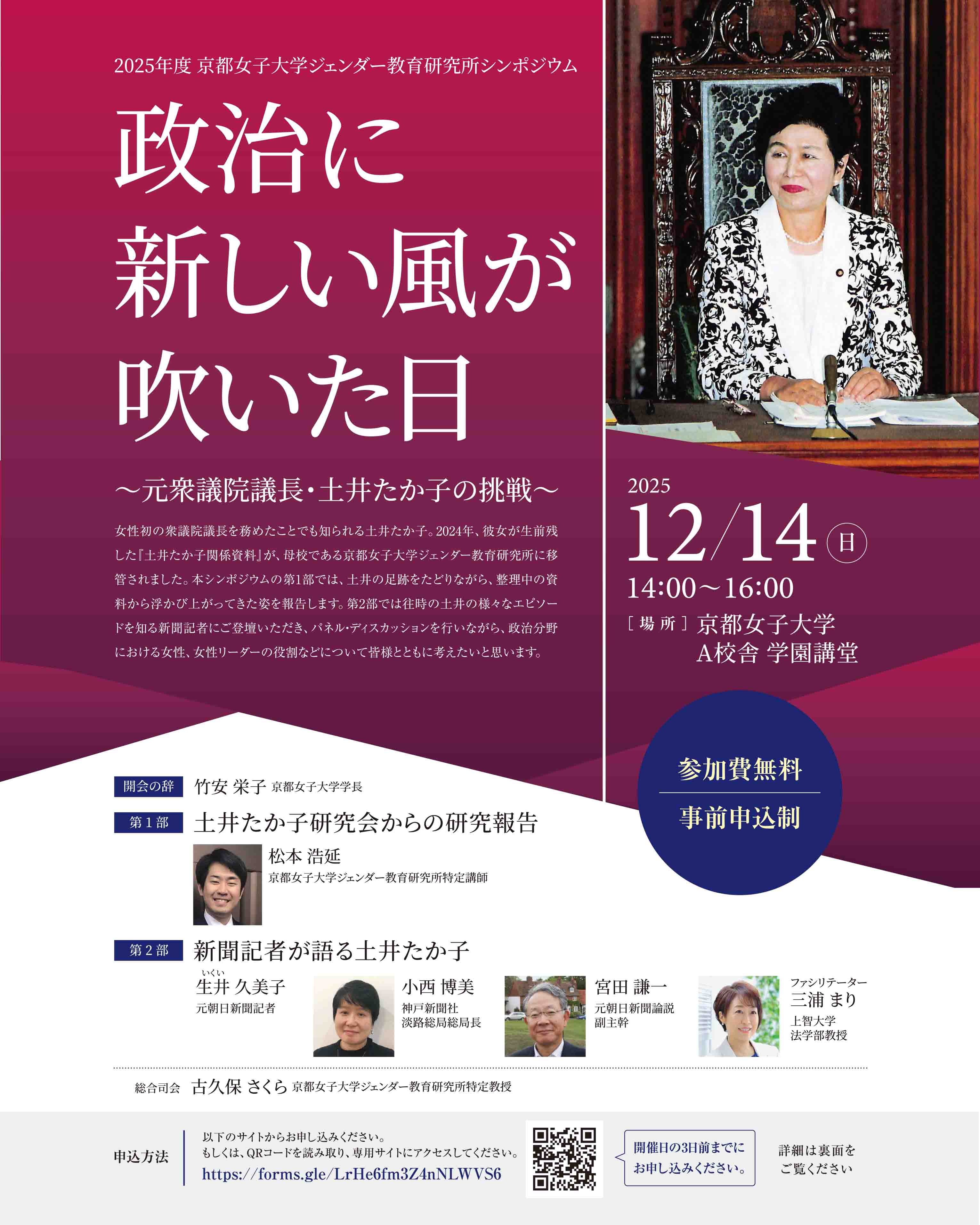 | 詳細: | ジェンダー教育研究所シンポジウム「政治に新しい風が吹いた日~元衆議院議長・土井たか子の挑戦~」を開催します。 女性初の衆議院議長をつとめたことでもしられる土井たか子。2024年、彼女が生前残した「土井たか子関係資料」が、母校である京都女子大学ジェンダー教育研究所に移管されました。本シンポジウムの第1部では、土井の足跡をたどりながら、整理中の資料から浮かび上がってきた姿を報告します。第2部では往時の土井の様々なエピソードを知る新聞記者にご登壇いただき、パネル・ディスカッションを行いながら、政治分野における女性、女性リーダーの役割などについて皆様とともに考えたいと思います。 参加費は無料で、本学校舎での会場参加とYouTube配信によるオンライン参加をお選びいただけます。 参加は事前申込制となっていますので、下記サイトよりお申し込みください。 参加申込はこちら⇒https://forms.gle/LrHe6fm3Z4nNLWVS6 皆様のご参加をお待ちしております。 テ ー マ:政治に新しい風が吹いた日~元衆議院議長・土井たか子の挑戦~ 日 時:12月14日(日)14時~16時 場 所: A校舎 学園講堂 参加方法:会場参加またはオンライン視聴(ライブ配信) 〈第1部:研究報告〉 講 題:土井たか子研究会からの研究報告 登壇者:松本 浩延(ジェンダー教育研究所特定講師) 〈第2部:パネル・ディスカッション〉 講 題:新聞記者が語る土井たか子 登壇者:生井 久美子 氏(元朝日新聞記者) 小西 博美 氏(神戸新聞社淡路総局総局長) 宮田 謙一 氏(元朝日新聞論説副主幹) 三浦 まり 氏(上智大学教授) |