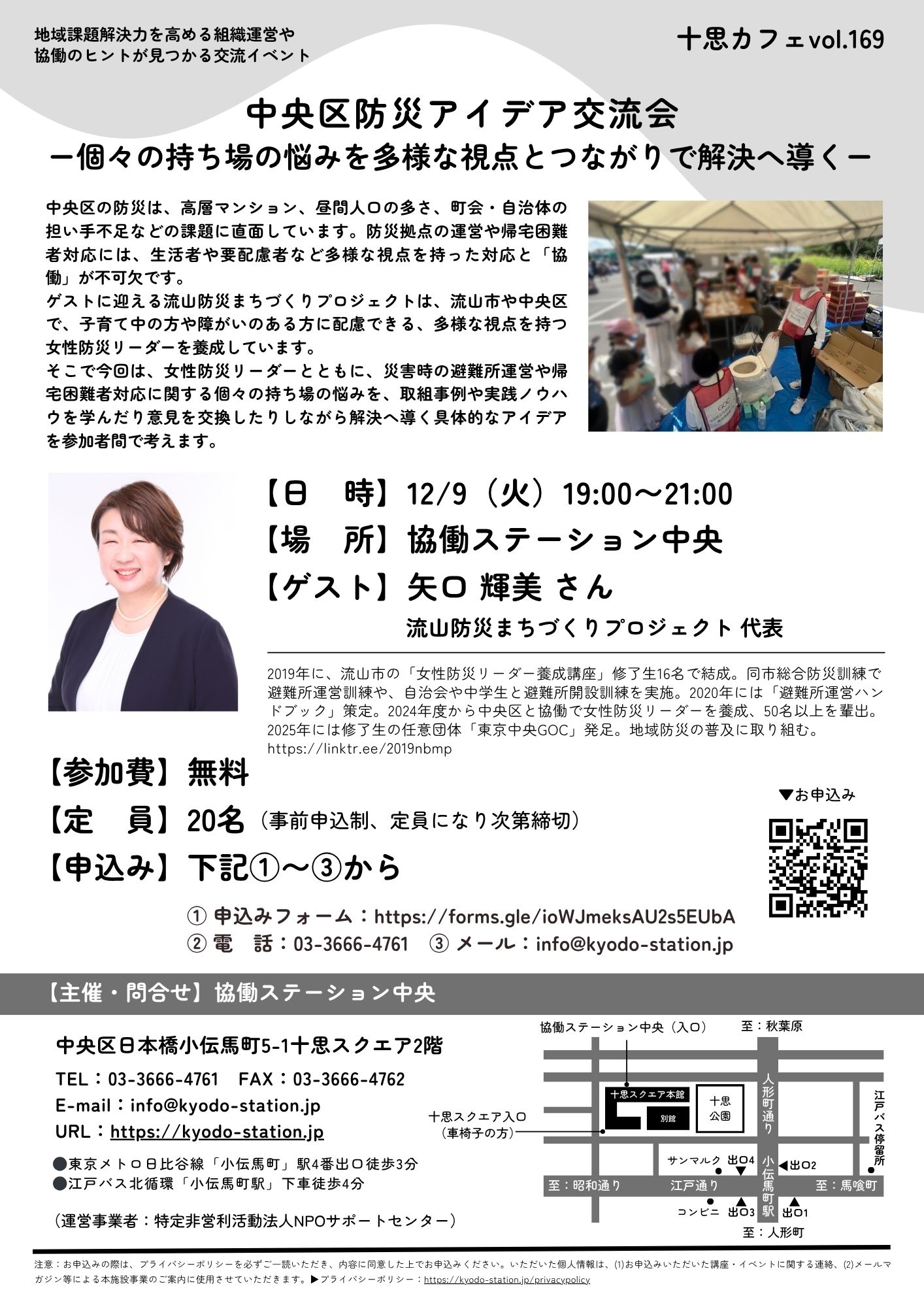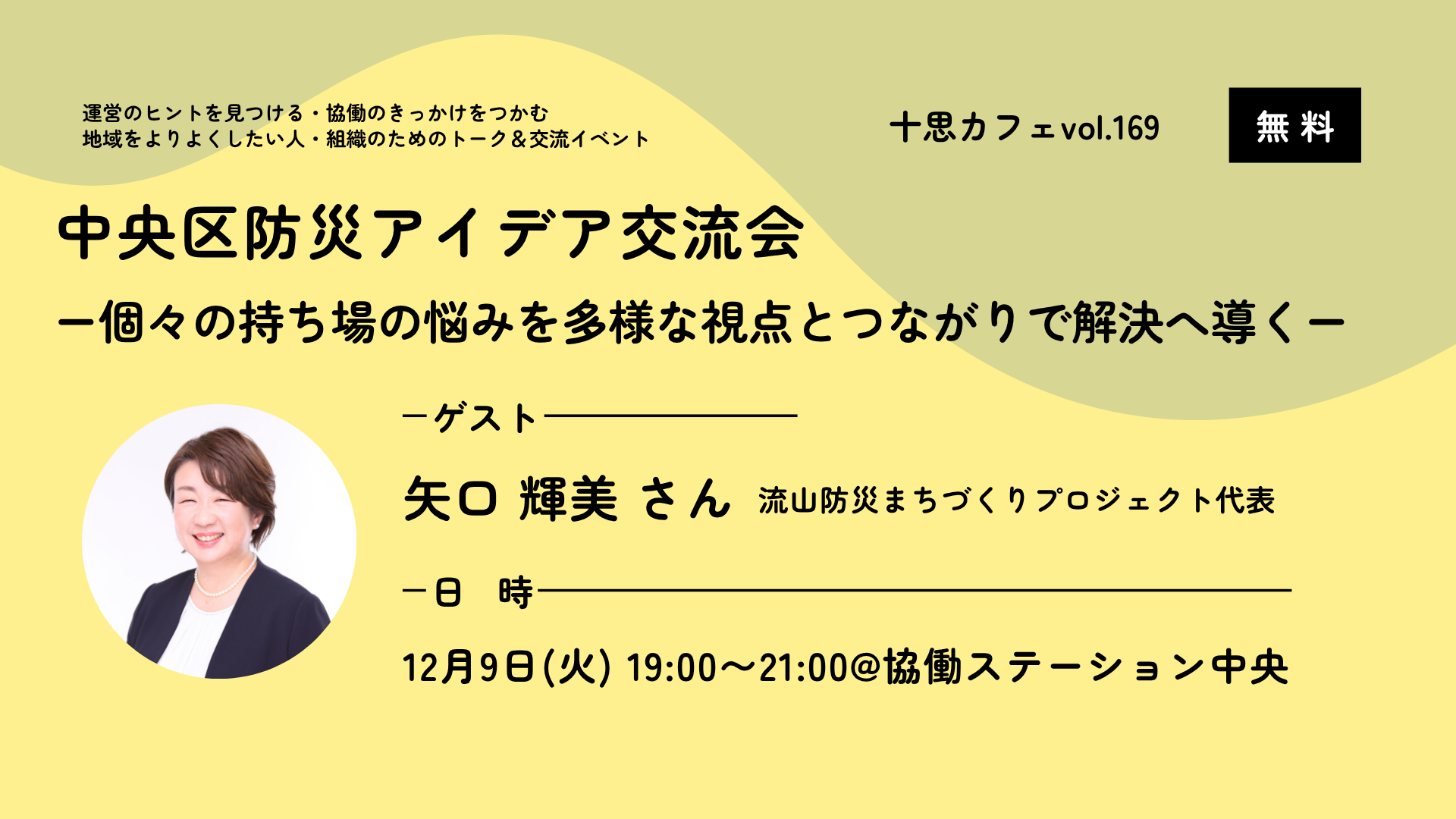 | 詳細: | 中央区の防災は、高層マンション、昼間人口の多さ、町会・自治体の担い手不足などの課題に直面しています。防災拠点の運営や帰宅困難者対応には、生活者や要配慮者など多様な視点を持った対応と「協働」が不可欠です。 ゲストに迎える流山防災まちづくりプロジェクトは、流山市や中央区で、子育て中の方や障がいのある方に配慮できる、多様な視点を持つ女性防災リーダーを養成しています。 そこで今回は、女性防災リーダーとともに、災害時の避難所運営や帰宅困難者対応に関する個々の持ち場の悩みを、取組事例や実践ノウハウを学んだり意見を交換したりしながら解決へ導く具体的なアイデアを参加者間で考えます。 【詳 細】 日 時:12/9(火)19:00〜21:00 会 場:協働ステーション中央 定 員:20名(先着順) 参加費:無料 【申込み】 以下(1)〜(4)の方法で申込み (1)申込みフォーム:https://forms.gle/ioWJmeksAU2s5EUbA (2)TEL:03-3666-4761 (3)FAX:03-3666-4762 (4)E-mail:info@kyodo-station.jp ※(2)~(4)の方法で申込む方は下記を添えてお申込みください。 ①お名前 ②メールアドレス ③ご所属 ④電話番号 ⑤参加動機 【ゲスト】 矢口 輝美さん(流山防災まちづくりプロジェクト代表) 2019年に、流山市の「女性防災リーダー養成講座」修了生16名で結成。同市総合防災訓練で避難所運営訓練や、自治会や中学生と避難所開設訓練を実施。2020年には「避難所運営ハンドブック」策定。2024年度から中央区と協働で女性防災リーダーを養成、50名以上を輩出。2025年には修了生の任意団体「東京中央GOC」発足。地域防災の普及に取り組む。https://linktr.ee/2019nbmp 【十思カフェとは】 地域課題解決力を高める組織運営や協働のヒントが見つかる交流イベントです。 月1回、地域課題の解決や新しい価値の創出に取り組むゲストを迎えます。新たな気づきやつながりが生まれています。 【問合せ】 協働ステーション中央 〒103-0001 東京都中央区日本橋小伝馬町 5-1 十思スクエア 2F TEL:03-3666-4761 FAX:03-3666-4762 E-mail:info@kyodo-station.jp URL:https://kyodo-station.jp 協働ステーション中央は(特活)NPO サポートセンターが 中央区から委託を受け運営しています。 |