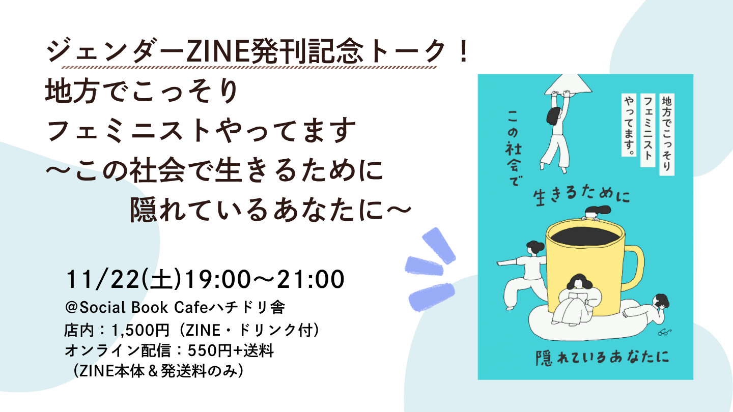 | 詳細: | ■■□――――――――――――――□■■ ジェンダーZINE発刊記念トーク! 地方でこっそりフェミニストやってます 〜この社会で生きるために隠れているあなたに〜 ■■□――――――――――――――□■■ 「私たちは、なぜこんなに息苦しいのか…」広島に限らず全国の地方都市でもあるあるの息苦しさに気づいたメンバーが、オンラインで情報交換し合い、同じように全国で息をひそめる仲間たちに届けたいと作成したZINEが、この度発刊を迎えます! 「息苦しいのは私が悪かったんじゃないんだ」 ZINEの執筆メンバーが、発刊に込めた思いや執筆エピソードなどお話しします。 ————イベント詳細———— 【日時】 11/22(土)19:00〜21:00 【会場】 Social Book Cafeハチドリ舎 広島市中区土橋町2-43-2F 【申し込み】 ◎店内参加(1,500円 ZINE・ドリンク付):https://forms.gle/6gveFiqkqJS1WA6YA ◎オンライン配信無料 -zoom参加:こちらからご登録ください https://us02web.zoom.us/…/register/Yv99V3ojRaCfOUcXFAWDPw -Youtube視聴:https://youtube.com/live/S7BocBfLCIo?feature=share ⭐️オンライン参加の方はぜひこちらからZINEをご購入ください♪ https://hachidorisha.stores.jp/…/68f0571b4d1d1d3844a7c90e 【主催】 ジェンダーを考えるひろしま県民有志 Social Book Cafe ハチドリ舎 【お問い合わせ】 TEL:082-576-4368 mail:hachidorisha@gmail.com ———————————————————— |