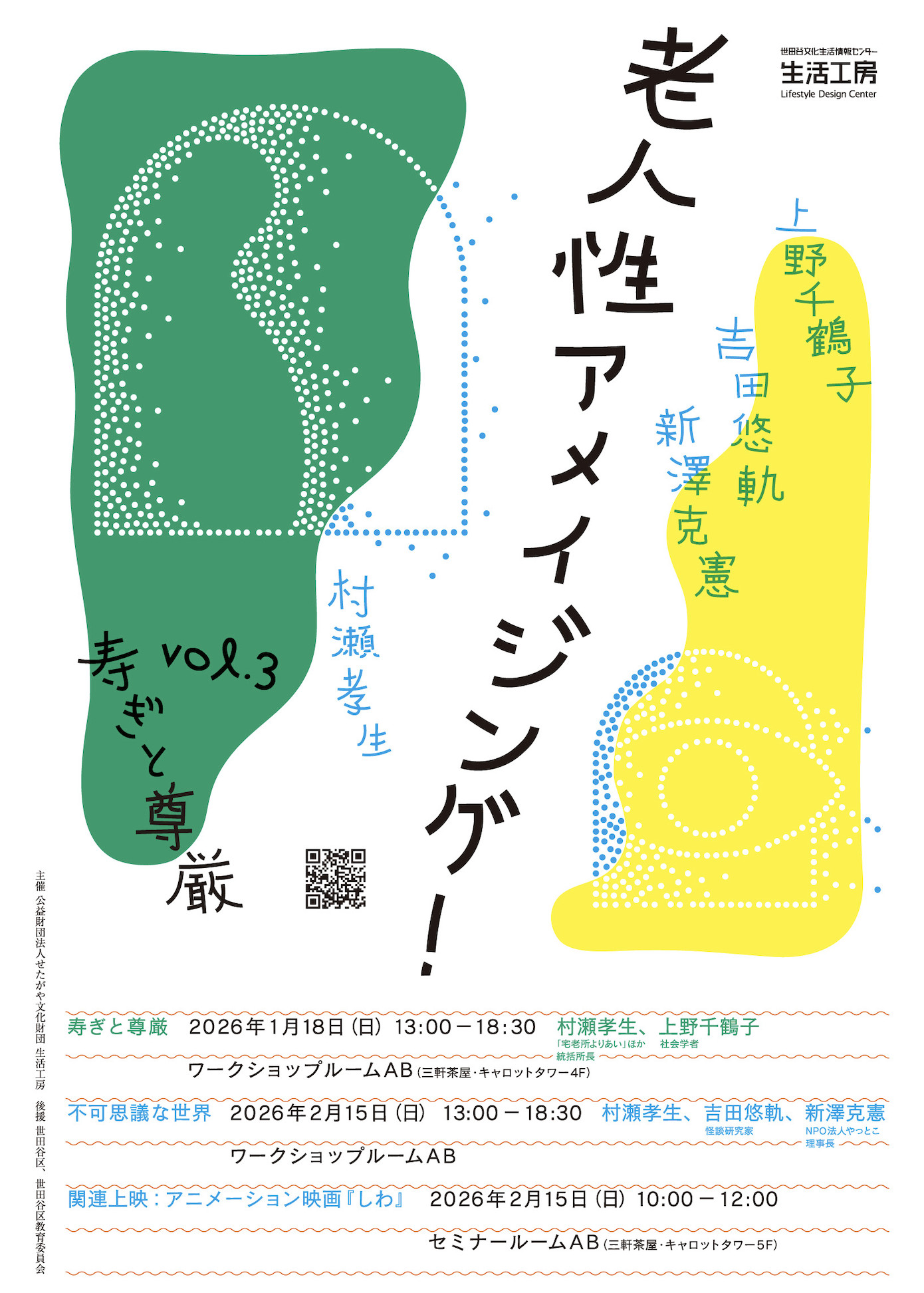 | 詳細: | <開催概要> ■講座名称:老人性アメイジングvol.3 寿ぎと尊厳 ■講座概要: 超高齢社会の現代。身体の衰えや記憶力の低下など「老い」を迎えることによって、それまでの自分が失われてしまうのではないかと不安に思う人もいるかもしれません。 一人一人の老いに寄り添う先進的ケアで全国的に注目を集める介護施設「宅老所よりあい」の村瀬孝生さんは、老いの世界を生きるお年寄りたちの真面目で滑稽な様子を、豊かなものとして積極的に捉え直す意味を込めて「老人性アメイジング」という言葉を提唱しました。それは、社会規範に適応してきたはずの自分が揺さぶられる戸惑いや、老いゆくことの不可思議さを体験する驚きを丸ごと肯定する人間観に立脚しています。既存の人間観へのこだわりを解きほぐし、より包括的で自由な人間像を模索する捉え直しの態度は、あらゆる世代の人に響くものです。 1回目は、村瀬さんが実践してきたケアや独自の死生観と、社会学者の上野千鶴子さんの『アンチ・アンチエイジングの思想』などを紐解き、「尊厳」をキーワードに老いや死の概念を積極的に更新します。 スケジュール 13:00~14:30《小噺》「老いと尊さ」 村瀬孝生 14:30~15:15《鼎談》村瀬孝生 × 上野千鶴子 × 山内泰 15:15~15:45 休憩 15:45~17:00《講演》「老いと尊厳 アンチエイジングの思想」 上野千鶴子 17:00~18:30《鼎談》村瀬孝生 × 上野千鶴子 × 山内泰 ※本企画は2日間のイベントとなります。2日目詳細については、イベントURLをご覧ください。 ■講師:村瀬孝生(むらせ・たかお)さん 「宅老所よりあい」「第2宅老所よりあい」「特別養護老人ホーム よりあいの森」(福岡市)の統括所長。時間割などを設けず “お年寄りの老いに沿う介護” の実践は、NHKで密着番組が放送されるなど多くの注目を集め、ユーモア溢れる語りで各地の講演会を沸かせている。主な著書に「シンクロと自由」(医学書院)、『ぼけてもいいよ』(西日本新聞社)、『増補新版おばあちゃんが、ぼけた。』(新曜社)他。 宅老所よりあい http://yoriainomori.com [よりあいの森 老いに沿う]人生の最期まで お年寄りの思いに“沿う”介護を|NHK https://www.web.nhk/tv/an/hntv/pl/series-tep-J89PNQQ4QW/ep/VW1QXVG9X4 ■講師:上野千鶴子(うえの・ちづこ)さん 社会学者、東京大学名誉教授、認定NPO法人ウィメンズアクションネットワーク(WAN)理事長。著書に『アンチ・アンチエイジングの思想ボーヴォワール「老い」を読む』(みすず書房)、『家父長制と資本制』『近代家族の成立と終焉』『生き延びるための思想』『当事者主権増補新版』(中西正司と共著)(以上、岩波書店)、『おひとりさまの老後』(文藝春秋)、『ケアの社会学』(太田出版)等。 ■日程:2026年1月18日 (日) 13時00分~18時30分(開場:午後12時40分~) ■会場:生活工房4F ワークショップルームAB ■費用・定員:3,000円(事前決済)・100名(申込先着) ■対象:どなたでも ■申込:申込フォーム(https://teket.jp/16272/59956)からお申込みください。 |