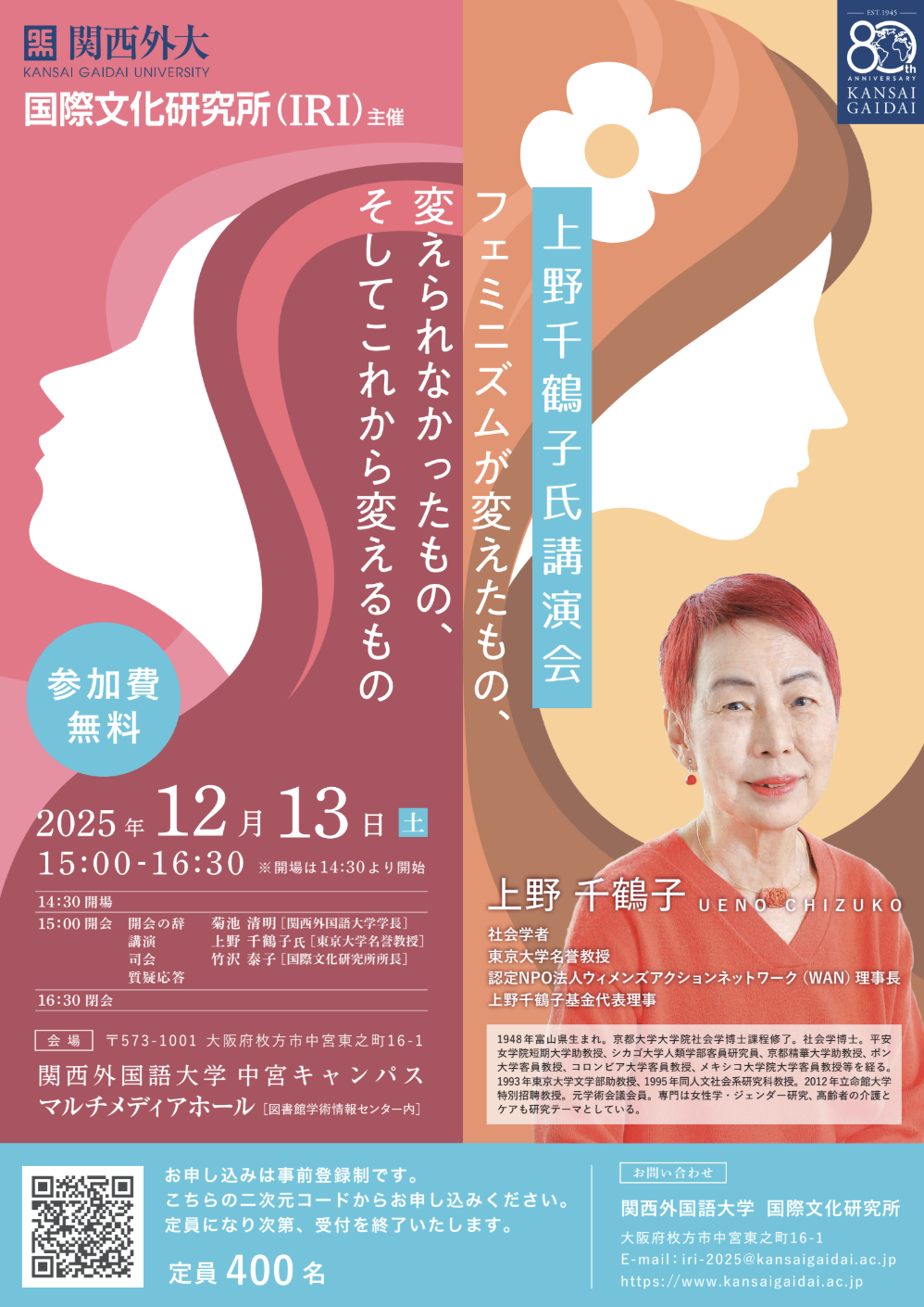 | 詳細: | 上野千鶴子氏の講演会「フェミニズムが変えたもの、変えられなかったもの、そしてこれから変えるもの」を12月13日に開催します 関西外国語大学 国際文化研究所は12月13日、社会学者で東京大学名誉教授の上野千鶴子氏による講演会を中宮キャンパスのマルチメディアホールで開催します。 ・日 時:2025年12月13日(土) 午後3時~午後4時30分 (開場:午後2時30分) ・講 師:上野 千鶴子 氏(社会学者/東京大学名誉教授) ・テーマ:「フェミニズムが変えたもの、変えられなかったもの、そしてこれから変えるもの」 ・会 場:本学中宮キャンパス 【マルチメディアホール】(5号館 1階) ・定 員:400名(参加無料) ・主 催:関西外国語大学 国際文化研究所 お申込みは事前登録制です。受講は二次元コードもしくはこちらからお申し込みください。(定員になり次第、受付を終了いたします) お問い合わせ:関西外国語大学 研究支援センター E-mail: iri-2025@kansaigaidai.ac.jp (注)お車でのご来場はご遠慮ください。 |