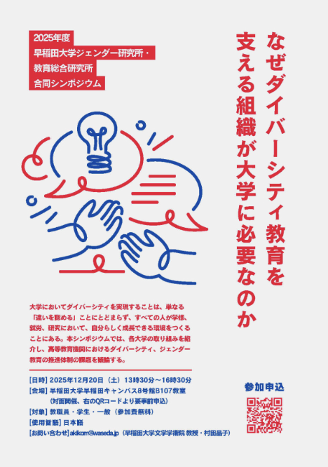 | 詳細: | 2025年度早稲田大学ジェンダー研究所・教育総合研究所 合同シンポジウム 「なぜダイバーシティ教育を支える組織が大学に必要なのか」 日時:2025年12月20日(土)13時30分〜16時30分 場所:早稲田大学早稲田キャンパス8号館B107教室 申込:https://docs.google.com/forms/d/e/1FAIpQLSdHoLShkH7mavzr7nt8-MuWdePeTWSXsR03m9ilppelO8Eh3A/viewform 登壇者:西本あずさ( 青山学院大学スクーンメーカー記念ジェンダー研究センター センター長)、田中真美(東北大学ダイバーシティ・エクイティ& インクルージョン(DEI)推進センター センター長・副学長)、秋林こずえ(同志社大学フェミニスト・ ジェンダー・セクシュアリティ研究(FGSS)センター センター長)、篠原初枝( 早稲田大学ダイバーシティ推進担当理事)、村田晶子( 早稲田大学)、弓削尚子(早稲田大学) |