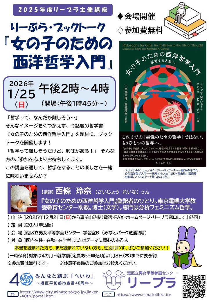 | 詳細: | 港区立男女平等参画センター(愛称:リーブラ)では、2026年1月25日(日)午後2時から主催講座「リーブラ・ブックトーク『女の子のための西洋哲学入門』」を開催します。参加は無料で、事前申し込み制となっております。下記、詳細となります。 <開催概要> ■講座名称:リーブラ・ブックトーク『女の子のための西洋哲学入門』 ■講座概要:「哲学って、なんだか難しそう…」そんなイメージをくつがえす、今話題の哲学書『女の子のための西洋哲学入門——思考する人生へ』(メリッサ・M・シュー/キンバリー・K・ガーチャー編、三木那由他/西條玲奈監訳、フィルムアート社、2024年)を題材に、ブックトークを開催します!「哲学って難しそうだけど、興味がある!」 そんな方のご参加を心よりお待ちしてます。この講座を通して、哲学をすることの楽しさを一緒に味わいませんか? ■講師:西條 玲奈 さん ・・・『女の子のための西洋哲学入門』監訳者のひとり。東京電機大学教養教育センター助教。博士(文学)。専門は分析フェミニズム哲学。 ■日程:2026年1月25日(日)午後2時~4時(開場:午後1時45分) ■会場:港区立男女平等参画センター リーブラ 学習室B ■費用・定員:無料(事前申し込み制)・20名(申し込み順) ■対象:区内在住・在勤・在学者またはテーマに関心がある人。本書を読まれた方も、まだ読まれていない方も、性別問わず、ぜひご参加ください! ■申込:お申込みは、リーブラHP「講座・イベント申込フォーム」(https://www.minatolibra.jp/event/apply/?post_id=16055)からお申込みください。 是非、この機会にリーブラにお越しいただき、ジェンダー平等、男女平等参画社会についての意識・知識を高めていただければ幸いです。 |
