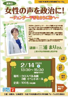 | 詳細: | イベント名:令和7年度高槻市男女共同参画フォーラム 日時:令和8年2月14日(土曜日)午後1時30分から午後3時30分まで(開場は午後1時から) 場所:クロスパル高槻8階 イベントホール 対象:テーマに関心のある方 定員:100名(申込順、申込多数の場合は市内在住、在勤、在学の方優先) 内容:2025年、日本のジェンダー・ギャップ指数は148カ国中118位です。特に日本の女性議員の比率は世界的に見ても極めて低く、政治分野におけるジェンダー平等の遅れが目立ちます。 今年度は、上智大学法学部教授の三浦まりさんを講師にお招きして、日本における政治参画の現状と課題、世界の取組を学び、これからのジェンダー平等社会について一緒に考えましょう。 午後1時30分から開始 ・開会 ・主催者挨拶 ・講演会 ・質疑応答 など 同時開催として、男女共同参画に関する登録団体の活動を紹介する「パネル展」や、「だれでも楽しく 家事・育児」フォトコンテストの投票を実施します。(こちらは申込は不要) 費用:無料 持ち物:なし 申し込み: <申込期間>令和8年1月5日(月曜日)から開始 <申込方法>簡易電子申込もしくは、電話(072-685-3725)、または直接、男女共同参画センター窓口へお申し込みください。 なお、休館日は以下のとおりです。 ・令和7年12月27日(土曜日)から令和8年1月3日(土曜日)まで ・令和8年1月10日(土曜日)から令和8年1月12日(月曜日・祝日)まで ・令和8年1月31日(土曜日)から令和8年2月1日(日曜日)まで ※保育申し込みは2月4日(水曜日)まで(先着順) ※電子申込の場合は、簡易電子申込(「令和7年度男女共同参画フォーラム」)<外部リンク> 参加時のお願い:当日、体調が優れない場合は、参加をご遠慮ください。 このページに関するお問い合わせ先 人権・男女共同参画課男女共同参画センター 大阪府高槻市紺屋町1-2(クロスパル高槻4階) Tel:072-685-3725 Fax:072-686-2455 お問い合わせフォーム<外部リンク> |