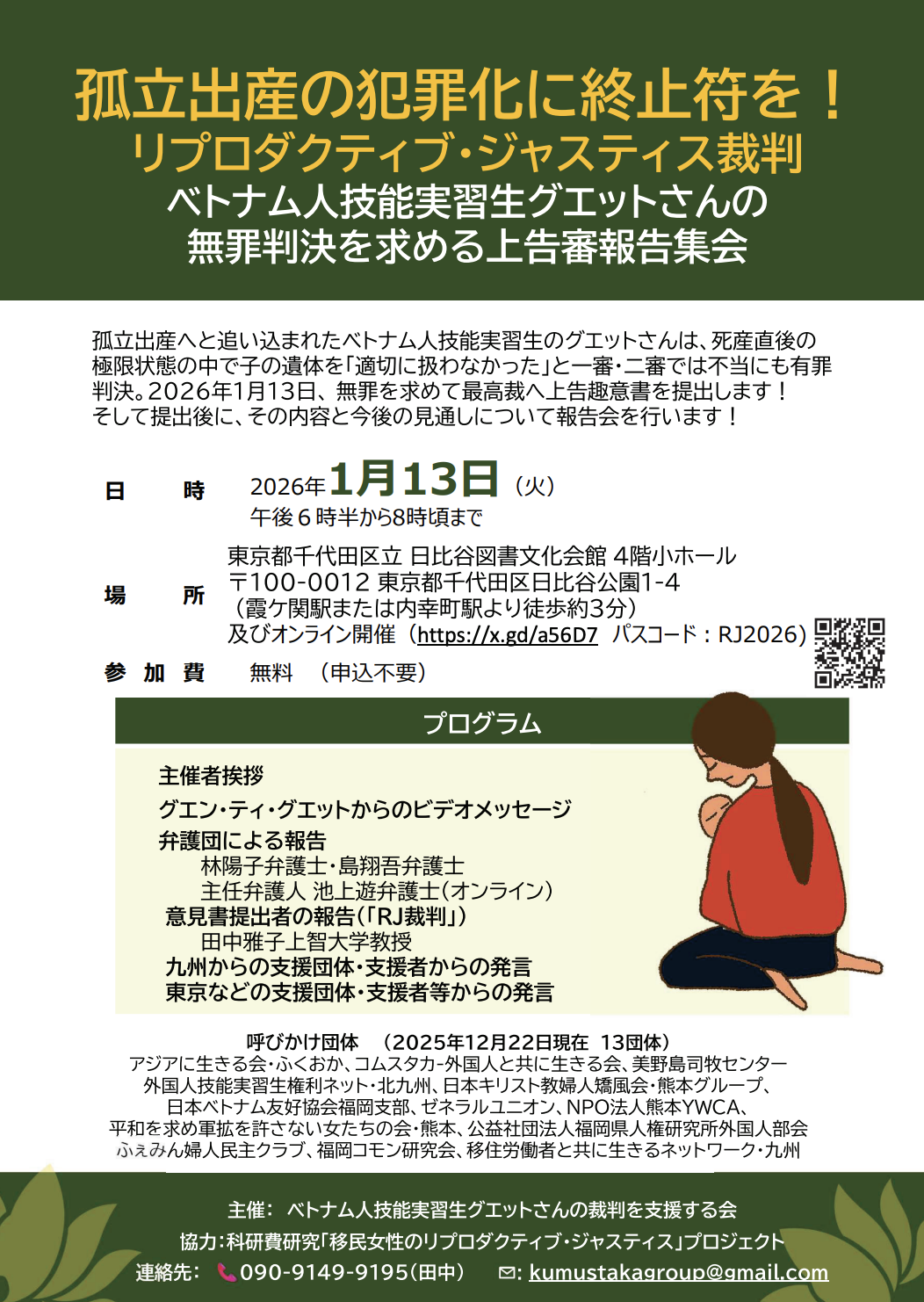 | 詳細: | 2024年2月に知人宅で孤立死産したベトナム人技能実習生グエットさんが、死体遺棄容疑で逮捕され、起訴される事件が起きました。刑事裁判の結果は、2025年3月7日に福岡地方裁判所で有罪判決(懲役1年6月、執行猶予3年)、 同年11月4日の福岡高裁での控訴審判決も「控訴棄却」の有罪判決でした。 グエットさんは2025年11月6日に最高裁に上告し、これまでの弁護団(男性3名)に新たに林陽子弁護士(東京 アテナ法律事務所、元国連女性差別撤廃委員会委員長)が加わり、4名の弁護団で、「孤立出産の犯罪化に終止符を、リプロダクティブ・ジャステイス(性と生殖に関する社会正義)裁判」として無罪判決を目指して挑むことになりました。 裁判の詳しい経過と論点、リプロダクテイブ・ジャステイス(性と生殖全般における社会正義)については、コムスタカー外国人と共に生きる会のホームページ: https://kumustaka.org/TITP/2025.12_TITP.html をご参照下さい。 リプロダクテイブ・ジャステイスは、「生殖の自由の議論を「個人の選択」から「社会の構造の転換」へと発展させた」重要な視点です。関連書籍に『リプロダクティブ・ジャスティス: 交差性から読み解く性と生殖・再生産の歴史』2025、人文書院 があります。 また、今年3月のCSW70(国連女性の地位委員会)は「女性と女児の司法へのアクセスの公正」がテーマでジャスティスは問われます。これに向けての勉強会もあります。https://jaww.info/news-detail.php?id=145 以下、お知らせとご協力のお願いです。 1.2026年1月13日(火)午後、最高裁判所門前で上告趣意書提出行動、司法記者クラブで記者会見の後、 同日午後6時30分から報告集会(日比谷図書文化会館小ホール)が開催されます。報告集会には林陽子弁護士、田中雅子上智大学教授も登壇予定です。是非、最高裁門前行動および報告集会に是非ご参加ください。報告集会はオンラインもあります。https://x.gd/a56D7 パスコード RJ2026(参加費無料・申込不要) 2.署名・意見書・寄付のご協力をお願い 1)無罪判決を求める署名 https://www.change.org/NguyetSanWaMuzai 周囲の方へもお知らせ下さい。なお、グエットさんの無罪を求めての署名は1回のみで既に高裁までに署名をした方は再度はできません。 2)寄付による支援 最高裁の上告審の弁護士費用や最高裁のある東京までの移動費が必要です。寄付金をお願いします。 クレジットカード:https://x.gd/pEkei 郵便振替:外国人技能実習生権利ネット・北九州 01750-8-84519 |