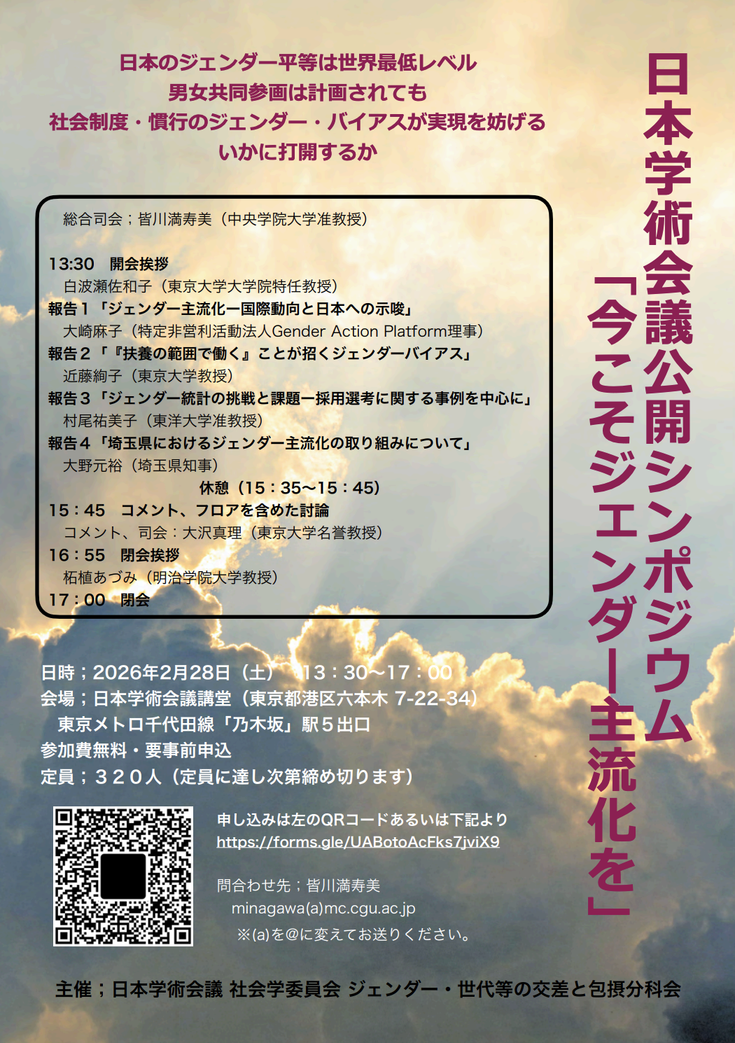 | 詳細: | 公開シンポジウム「今こそジェンダー主流化を」 詳細:https://www.scj.go.jp/ja/event/2026/392-s-0228.html 1999年に男女共同参画社会基本法が制定されてから四半世紀が経過した。 この法律では、「国は、…男女共同参画社会の形成の促進に関する施策(積極的改善措置を含む。以下同じ)を総合的に策定し、及び実施する責務を有する」と規定されている。その際にのっとるべき「基本理念」として、男女の人権の尊重とともに「社会における制度又は慣行についての配慮」が規定されている。後者の理念が踏まえるのは、社会制度・慣行がジェンダー・バイアスを含み、個人の選択に中立でない影響を及ぼすことで、ジェンダー平等化を阻害しかねない、という点である。そこで制度・慣行の影響を中立なものとするよう配慮することが求められる。 これは1995年の北京行動綱領で「ジェンダーの主流化」が強調されたことに応じる規定であり、1975年国際婦人年以来の累次の「国内行動計画」に対して、国・地方公共団体・国民の責務を明示するとともに責務の範囲を画期的に広げるものだった。 しかし、四半世紀後の現在、日本のジェンダー平等の実態は、ジェンダーギャップ指数も示すような世界最低のレベルにある。本シンポジウムではこの実態について、「ジェンダー主流化」という視角から迫り、政府等の取組に求められるものを明らかにして、より強力な取組の構築を呼びかける。 イベント概要 開催日時 令和8(2026)年2月28日(土)13:30~17:00 開催地 日本学術会議講堂(東京都港区六本木 7-22-34) 対象 どなたでも参加いただけます。 定員 320人 プログラム 総合司会:皆川満寿美(日本学術会議連携会員/中央学院大学現代教養学部准教授) 13:30 開会挨拶 白波瀬佐和子(日本学術会議第一部会員、社会学委員会ジェンダー・世代等の交差と包摂分科会委員長/東京大学大学院農学生命科学研究科特任教授) 13:35 報告1「ジェンダー主流化ー国際動向と日本への示唆」 大崎麻子(特定非営利活動法人Gender Action Platform理事、国連女性の地位委員会(CSW)日本代表、内閣府男女共同参画局計画実行・監視専門調査会委員、第6次基本計画策定専門調査会委員) 14:05 報告2「『扶養の範囲で働く』ことが招くジェンダーバイアス」 近藤絢子(日本学術会議連携会員/東京大学社会科学研究所教授) 14:35 報告3「ジェンダー統計の挑戦と課題ー採用選考に関する事例を中心に」 村尾祐美子(日本学術会議連携会員/東洋大学社会学部准教授) 15:05 報告4「埼玉県におけるジェンダー主流化の取り組みについて」 大野元裕(埼玉県知事) 15:35〜15:45 休憩 15:45 コメント、フロアを含めた討論 コメント及び司会:大沢真理(日本学術会議連携会員/東京大学名誉教授) 16:55 閉会挨拶 柘植あづみ(日本学術会議連携会員/明治学院大学社会学部教授) 17:00 閉会 申込み 参加費無料・要事前申込 以下の申込フォームより、申し込み(定員に達し次第締め切ります。最終締め切り;2月25日(水)23:59)。 参加申し込みフォームへのリンク 問い合わせ 皆川満寿美(中央学院大学) メールアドレス:minagawa(a)mc.cgu.ac.jp ※(a)を@に変えてお送りください。 備考 主催:日本学術会議社会学委員会ジェンダー・世代等の交差と包摂分科会 |