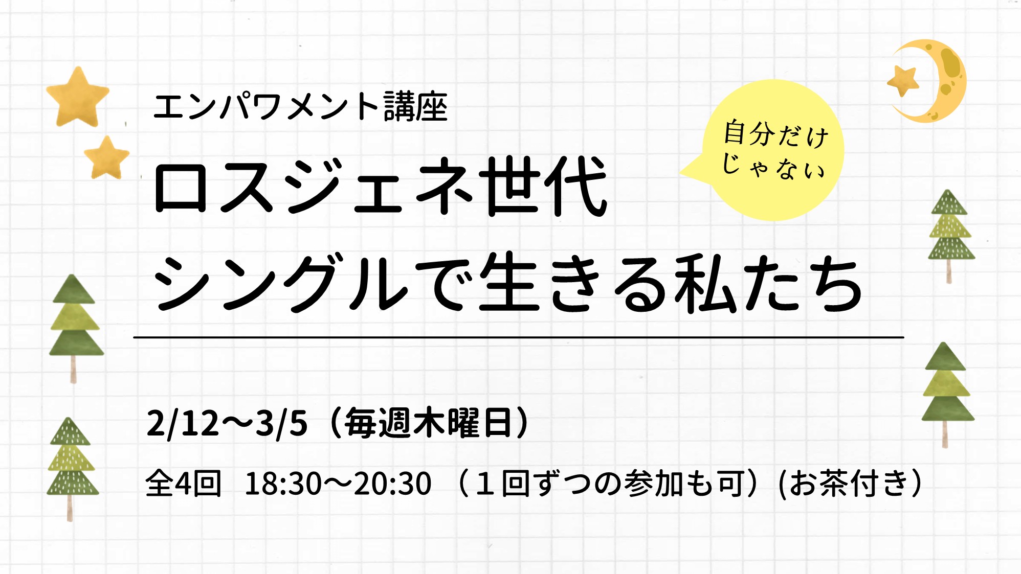 | 詳細: | ロスジェネ世代は、バブル崩壊後に、景気が低迷し、仕事やキャリア、結婚、子どもなど、人生の選択肢が狭められた世代とも言われています。 シングルである事、非正規、お金の不安、今は楽しいけど、これから先は分からない・・・など同じロスジェネ世代、シングル同士で語り合いませんか? 今の状況を整理し、自分らしい一歩を考えてみます。 <日程と講師> ②2/19(木)③2/26(木) 【社会を知る・自分を知る(CR(語り合い)とワーク)】 田上 時子さん(NPO法人 女性と子どものエンパワメント関西 理事長) ④3/5(木)【見つけてみよう わたしの小さな一歩(講演とワーク)】 佐々木 妙月 さん(情報の輪サービス株式会社 代表取締役) ★1回ごとの参加も可。お茶付きです♪ ★CRとは・・・同じメンバーで体験や感情をあなた自身の言葉で話します。 批判や中傷をせずに、お互いを尊重しながら聴き合う事で、自分の本当の気持ちや感覚に気付く語り合いの場です。 無理に話す必要はなく沈黙も尊重します。 日程:2/12(木)2/19(木)2/26(木)3/5(木) 各18時30分~20時30分 会場:宝塚市立男女共同参画センター 学習交流室1AB 宝塚市栄町2丁目1番2号ソリオ2・4階 先着:20人(予約優先・先着順) 一時保育:10人(1歳~就学前まで)無料・2/4(水)までに要予約 参加費:無料 申込:受付中。 電話0797-86-4006または窓口、 宝塚市立男女共同参画センター ホームページにて受付 |