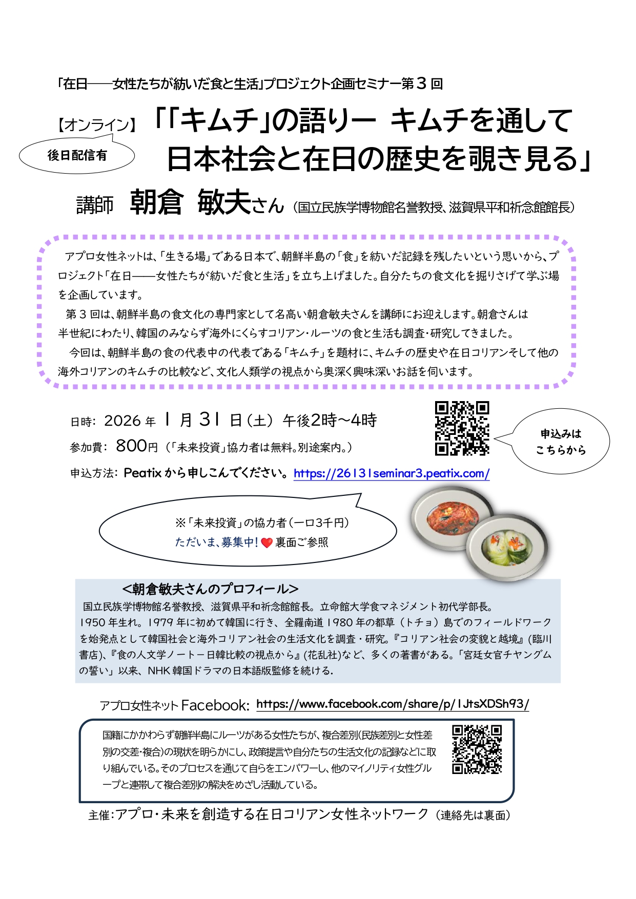 | 詳細: | 「在日——女性たちが紡いだ食と生活」プロジェクト企画セミナー第3回 【オンライン】 「「キムチ」の語りー キムチを通して 日本社会と在日の歴史を覗き見る」 講師 朝倉 敏夫さん (国立民族学博物館名誉教授、滋賀県平和祈念館館長) アプロ女性ネットは、「生きる場」である日本で、朝鮮半島の「食」を紡いだ記録を残したいという思いから、プロジェクト「在日——女性たちが紡いだ食と生活」を立ち上げました。自分たちの食文化を掘りさげて学ぶ場を企画しています。 第3回は、朝鮮半島の食文化の専門家として名高い朝倉敏夫さんを講師にお迎えします。朝倉さんは半世紀にわたり、韓国のみならず海外にくらすコリアン・ルーツの食と生活も調査・研究してきました。 今回は、朝鮮半島の食の代表中の代表である「キムチ」を題材に、キムチの歴史や在日コリアンそして他の海外コリアンのキムチの比較など、文化人類学の視点から奥深く興味深いお話を伺います。 日時: 2026年 1月31日(土) 午後2時~4時 参加費: 800円 (「未来投資」協力者は無料。別途案内。) 申込方法: Peatixから申しこんでください。 https://26131seminar3.peatix.com/ <朝倉敏夫さんのプロフィール> 国立民族学博物館名誉教授、滋賀県平和祈念館館長。立命館大学食マネジメント初代学部長。 1950年生れ。1979年に初めて韓国に行き、全羅南道1980年の都草(トチョ)島でのフィールドワークを始発点として韓国社会と海外コリアン社会の生活文化を調査・研究。『コリアン社会の変貌と越境』(臨川書店)、『食の人文学ノート-日韓比較の視点から』(花乱社)など、多くの著書がある。「宮廷女官チヤングムの誓い」以来、NHK韓国ドラマの日本語版監修を続ける. |