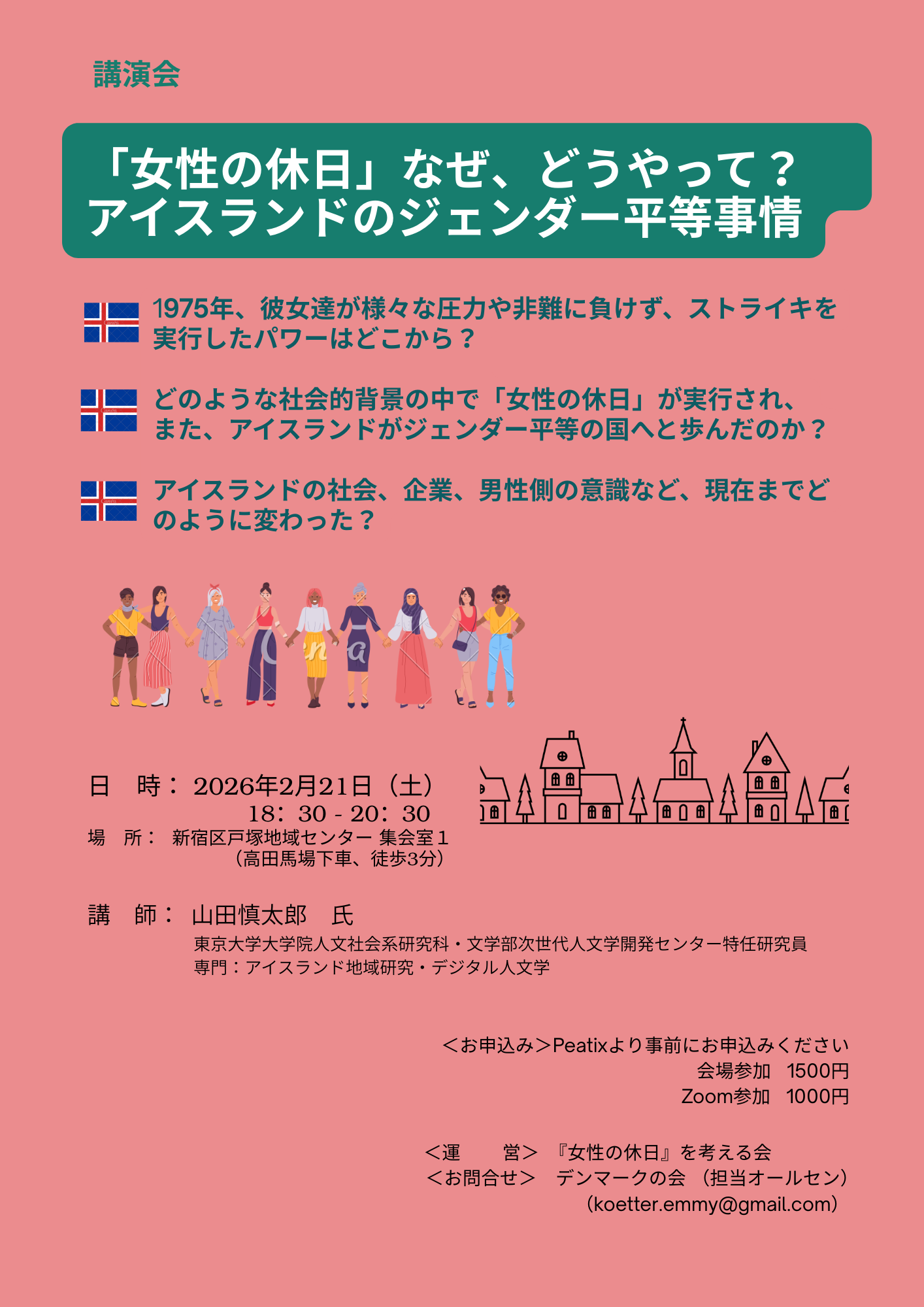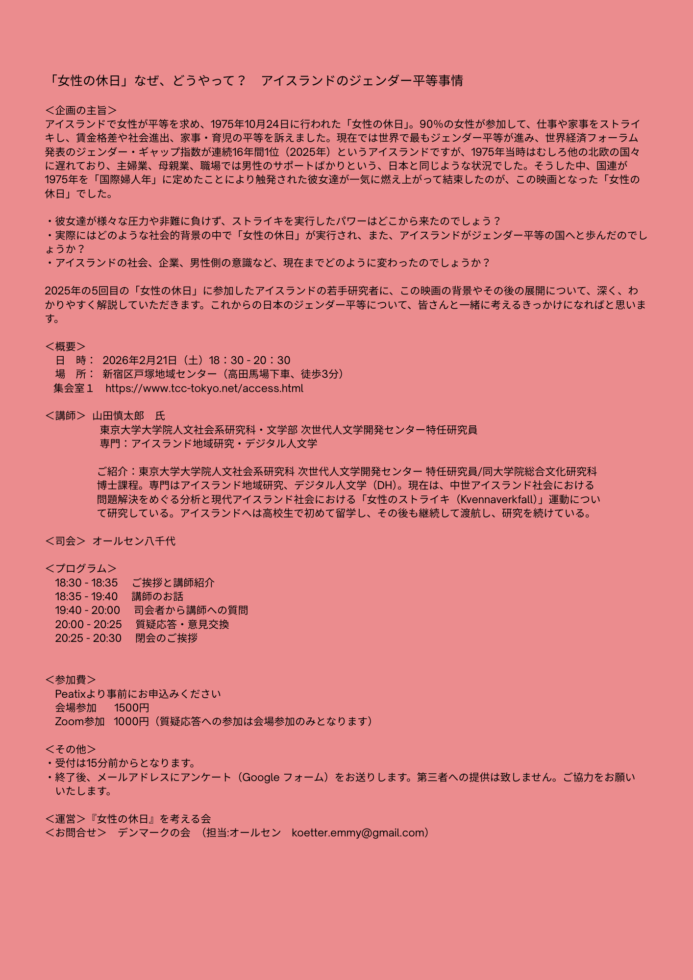 | 詳細: | <企画の主旨> アイスランドで女性が平等を求め、1975年10月24日に行われた「女性の休日」。90%の女性が参加して、仕事や家事をストライ キし、賃金格差や社会進出、家事・育児の平等を訴えました。現在では世界で最もジェンダー平等が進み、世界経済フォーラム 発表のジェンダー・ギャップ指数が連続16年間1位(2025年)というアイスランドですが、1975年当時はむしろ他の北欧の国々 に遅れており、主婦業、母親業、職場では男性のサポートばかりという、日本と同じような状況でした。そうした中、国連が 1975年を「国際婦人年」に定めたことにより触発された彼女達が一気に燃え上がって結束したのが、この映画となった「女性の 休日」でした。 ・彼女達が様々な圧力や非難に負けず、ストライキを実行したパワーはどこから来たのでしょう? ・実際にはどのような社会的背景の中で「女性の休日」が実行され、また、アイスランドがジェンダー平等の国へと歩んだのでし ょうか? ・アイスランドの社会、企業、男性側の意識など、現在までどのように変わったのでしょうか? 2025年の5回目の「女性の休日」に参加したアイスランドの若手研究者に、この映画の背景やその後の展開について、深く、わ かりやすく解説していただきます。これからの日本のジェンダー平等について、皆さんと一緒に考えるきっかけになればと思いま す。 <概要> 日 時: 2026年2月21日(土)18:30 - 20:30 場 所: 新宿区戸塚地域センター(高田馬場下車、徒歩3分) 集会室1 https://www.tcc-tokyo.net/access.html <講師> 山田慎太郎 氏 東京大学大学院人文社会系研究科・文学部 次世代人文学開発センター特任研究員 専門:アイスランド地域研究・デジタル人文学 ご紹介:東京大学大学院人文社会系研究科 次世代人文学開発センター 特任研究員/同大学院総合文化研究科 博士課程。専門はアイスランド地域研究、デジタル人文学(DH)。現在は、中世アイスランド社会における 問題解決をめぐる分析と現代アイスランド社会における「女性のストライキ(Kvennaverkfall)」運動につい て研究している。アイスランドへは高校生で初めて留学し、その後も継続して渡航し、研究を続けている。 <司会> オールセン八千代 <プログラム> 18:30 - 18:35 ご挨拶と講師紹介 18:35 - 19:40 講師のお話 19:40 - 20:00 司会者から講師への質問 20:00 - 20:25 質疑応答・意見交換 20:25 - 20:30 閉会のご挨拶 <参加費> Peatixより事前にお申込みください。https://joseinokyuujitsu.peatix.com/ 定員あり 会場参加 1500円 Zoom参加 1000円(質疑応答への参加は会場参加のみとなります) <その他> ・受付は15分前からとなります。 ・終了後、メールアドレスにアンケート(Google フォーム)をお送りします。第三者への提供は致しません。ご協力をお願い いたします。 <運営>『女性の休日』を考える会 <お問合せ> デンマークの会 (担当:オールセン koetter.emmy@gmail.com) |