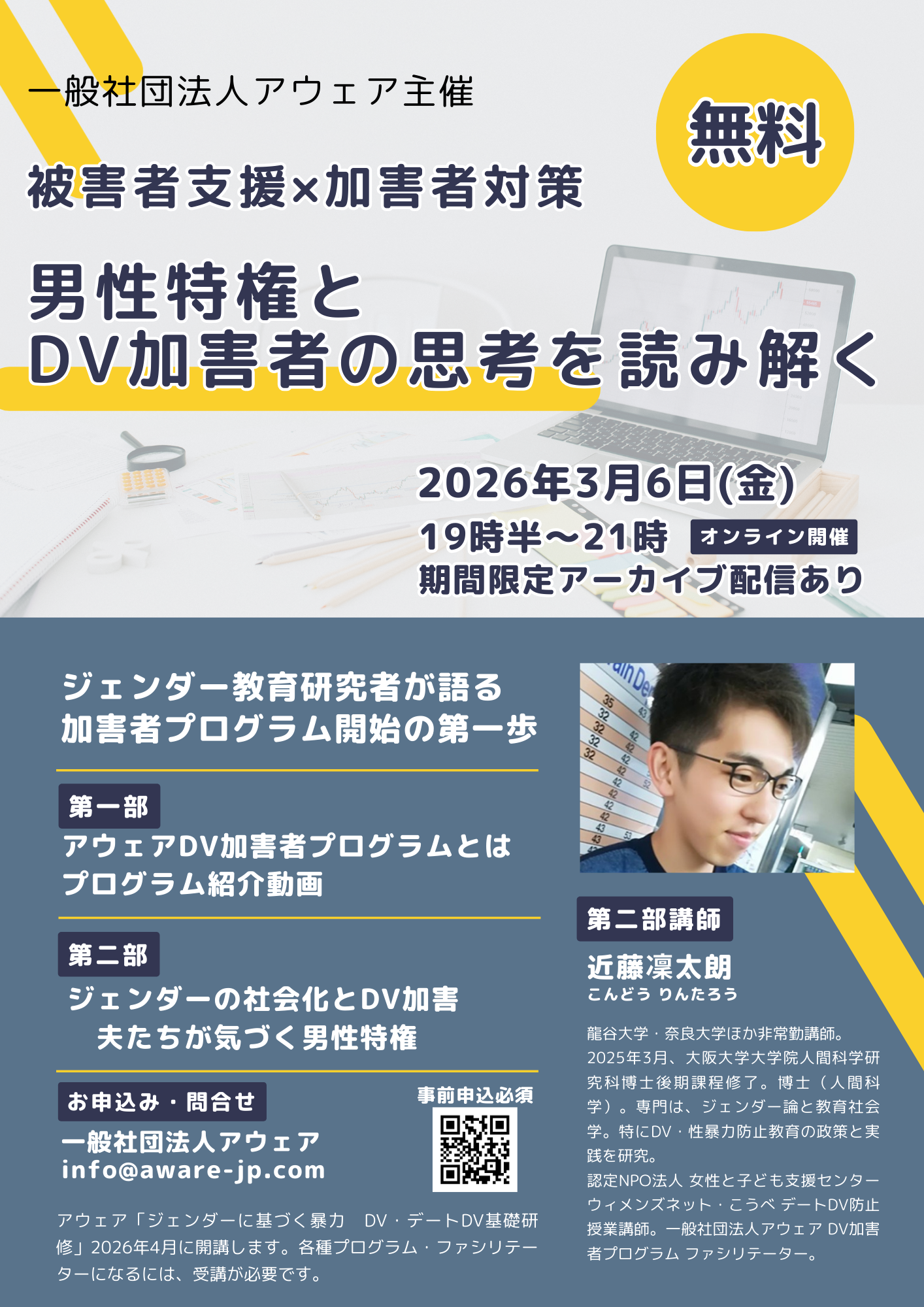 | 詳細: | 一般社団法人アウェアは、DV加害者プログラムを2002年から23年間、被害者とそのこどもたちを支援する目的で実施してきました。 DVは、ジェンダーに基づく暴力で、親密な関係にあるパートナーを「支配」する目的で行う「力」の濫用です。 ジェンダーとDV加害はどう関係するのか?プログラムで何をするのか?被害者支援の一環とは? このたび、そんな疑問に答える講座(無料)を企画しました。 グループで行うDV加害者プログラムの様子を伝える動画(約9分)を紹介し、ジェンダー教育の研究者がDVの予防と介入に必要な再教育プログラムについて語ります。 家庭に「支配者」は要りません。 こどもたちの未来や、安心して育つ環境のことを大切に考える方たち、行政関係者はじめ個人の皆さんにぜひ、届けたい情報です。 ------- 被害者支援×加害者対策 男性特権とDV加害者の思考を読み解く 90分間のオンライン(zoomミーティング)イベント 参加費無料 2026年3月6日(金)19:30〜21:00 ※質疑応答部分を除いて期間限定アーカイブ配信あり 〇対象 DV被害者支援に関わる方々はじめ広く一般 DV加害者プログラムを検討したいもしくは検討中の行政関係者や個人の皆さん 〇内容 第一部 アウェアDV加害者プログラムとは・プログラム紹介動画 第二部 ジェンダーの社会化とDV加害 夫たちが気づく男性特権 第二部講師 近藤凜太朗さん 龍谷大学・奈良大学ほか非常勤講師。 2025年3月、大阪大学大学院人間科学研究科博士後期課程修了。博士(人間科学)。専門は、ジェンダー論と教育社会学。特にDV・性暴力防止教育の政策と実践を研究。 認定NPO法人 女性と子ども支援センター ウィメンズネット・こうべ デートDV防止授業講師。一般社団法人アウェア DV加害者プログラム ファシリテーター。 〇申込 peatixにて https://aware202603.peatix.com ※参加費は無料ですが、事前申込みが必要です。 ※当日のzoomURLは、「当日ライブ参加」と「未定・不明」を選択された方のメールアドレス(申込フォームに記入されたもの)に送ります。 ※ライブ参加の方にも、アーカイブ視聴URLをお送りします。 〇申込み締切 3月5日18時まで 〇主催 一般社団法人アウェア DVをなくすことでジェンダー平等・公正社会をめざして活動している民間教育機関。 (1)デートDV防止プログラム(2)DV被害女性プログラム(3)DV加害者プログラム(4)ジェンダー平等プロジェクトを実施し関連講座を提供するほか、各プログラムの実施者養成を行っている。 HP:https://aware-jp.com/ |