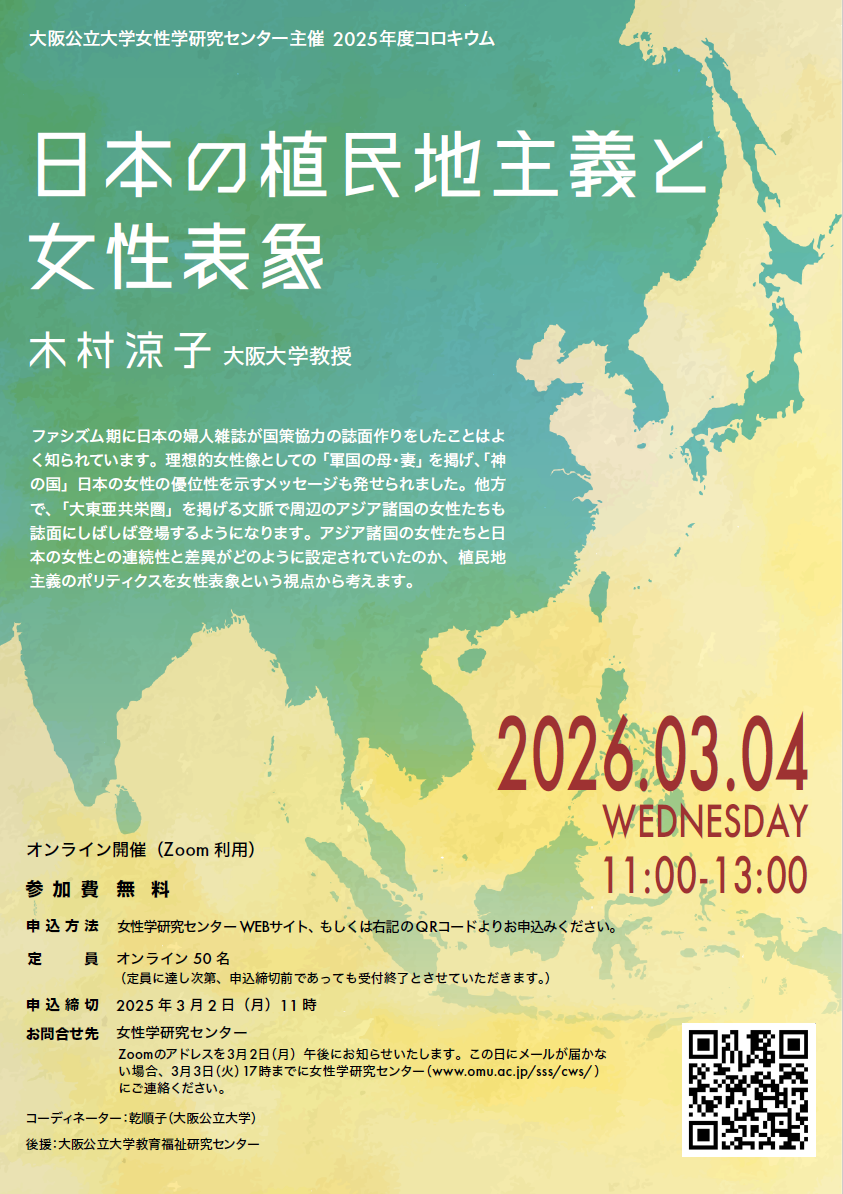 | 詳細: | 【タイトル】 日本の植民地主義と女性表象 【講師】 木村涼子氏 (大阪大学教授) ファシズム期に日本の婦人雑誌が国策協力の誌面作りをしたことはよく知られています。理想女性像としての「軍国の母・妻」を掲げ、「神の国」日本の女性の優位性を示すメッセージも発せられました。他方で、「大東亜共栄圏」を掲げる文脈で周辺のアジア諸国の女性たちも誌面にしばしば登場するようになります。アジア諸国の女性たちと日本の女性との連続性と差異がどのように設定されていたのか、植民地主義のポリティクスを女性表象という視点から考えます。 【参加費】 無料 【申込方法】 リンク先の申し込みフォーム、もしくはチラシのQRコードよりお申込みください。 申込締切 3月2日(月) 11時 定員 オンライン50名(定員に達し次第、申込締切前であっても受付終了とさせていただきます。) ご関心のある方はぜひご参加ください。 |