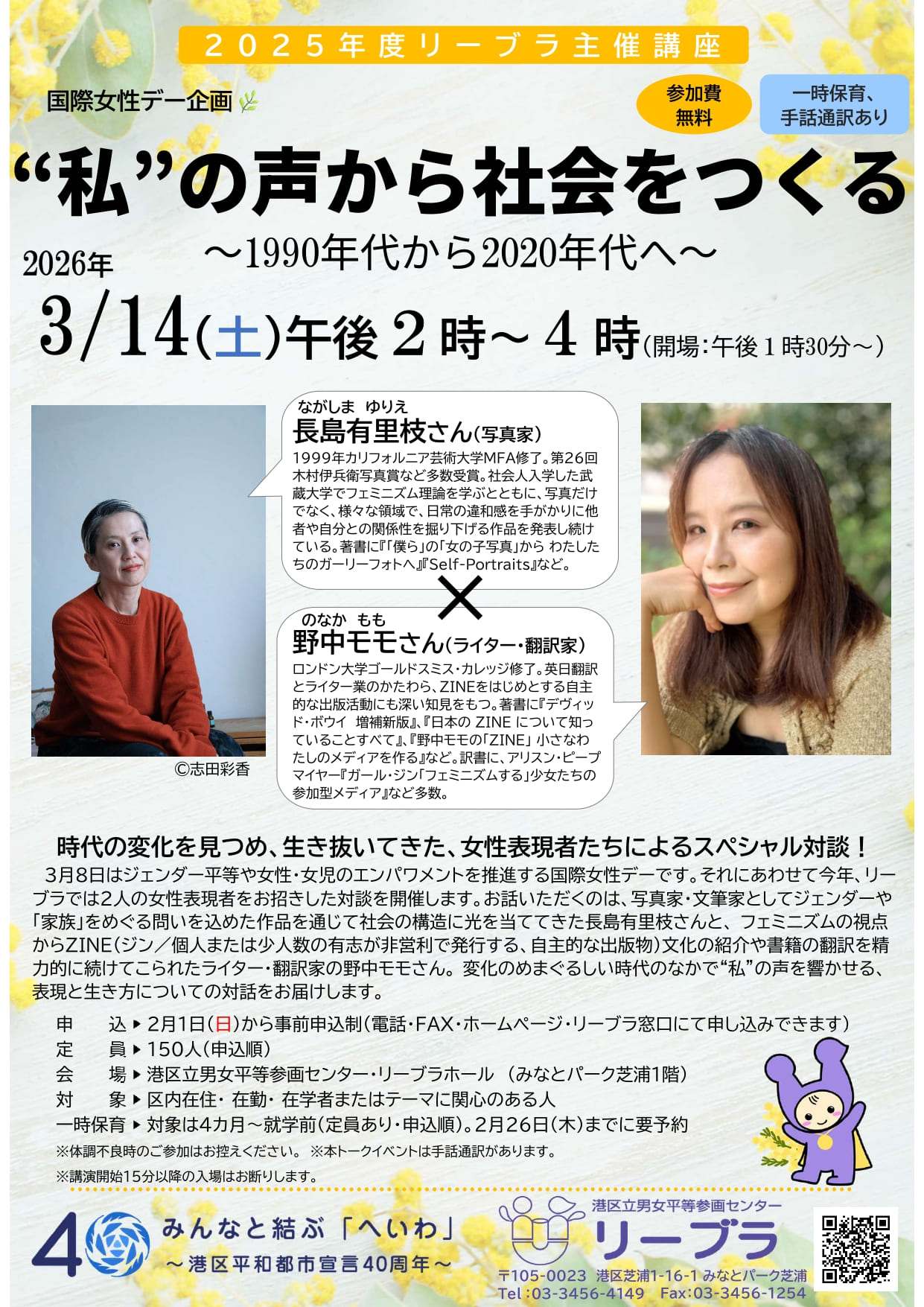 | 詳細: | 国際女性デー企画「“私”の声から社会をつくる~1990年代から2020年代へ~」 時代の変化を見つめ、生き抜いてきた、女性表現者たちによるスペシャル対談! 3月8日はジェンダー平等や女性・女児のエンパワメントを推進する国際女性デーです。それにあわせて今年、リーブラでは2人の女性表現者をお招きした対談を開催します。お話いただくのは、写真家・文筆家としてジェンダーや「家族」をめぐる問いを込めた作品を通じて社会の構造に光を当ててきた長島有里枝さんと、 フェミニズムの視点からZINE(ジン/個人または少人数の有志が非営利で発行する、自主的な出版物)文化の紹介や書籍の翻訳を精力的に続けてこられたライター・翻訳家の野中モモさん。 変化のめまぐるしい時代のなかで“私”の声を響かせる、表現と生き方についての対話をお届けします。 【開催日】 2026年3月14日(土)14:00~16:00 【申込み】 2026年2月1日(日)より、電話・FAX・ホームページ・リーブラ窓口にて申し込みできます。 【申込締切】 定員に達し次第、申し込み受付終了 【会場】 港区立男女平等参画センター・リーブラホール 【対象】 区内在住・在勤・在学者、テーマに関心のある人 【定員】 150名(先着順) 【参加費】 無料 【保育】 対象は4カ月~未就学児(定員あり・申込順)。 2月26日(木)までに要予約 *** *** *** 【連携特別展示企画】 「“私”の声を届ける~野中モモさん推薦フェミニズムZINEの世界」 展示期間:2026年3月1日(日)~3月16日(月) 開館時間:午前9時~午後9時30分(※最終日は5時まで) 場所:リーブラ入口スペース 各地で大規模な即売会が開かれるなど、今や多方面の注目を集めるZINE(ジン)。 ZINEカルチャーに詳しい翻訳家・ライターの野中モモさんがセレクトした、国内外のフェミニストによるZINEを約50点展示します。現在は入手が難しいものも含む、野中さんの貴重なプライベート・コレクションもご覧いただけます。 この機会に、小さな冊子から広がる新しい世界の魅力に触れてみませんか? |