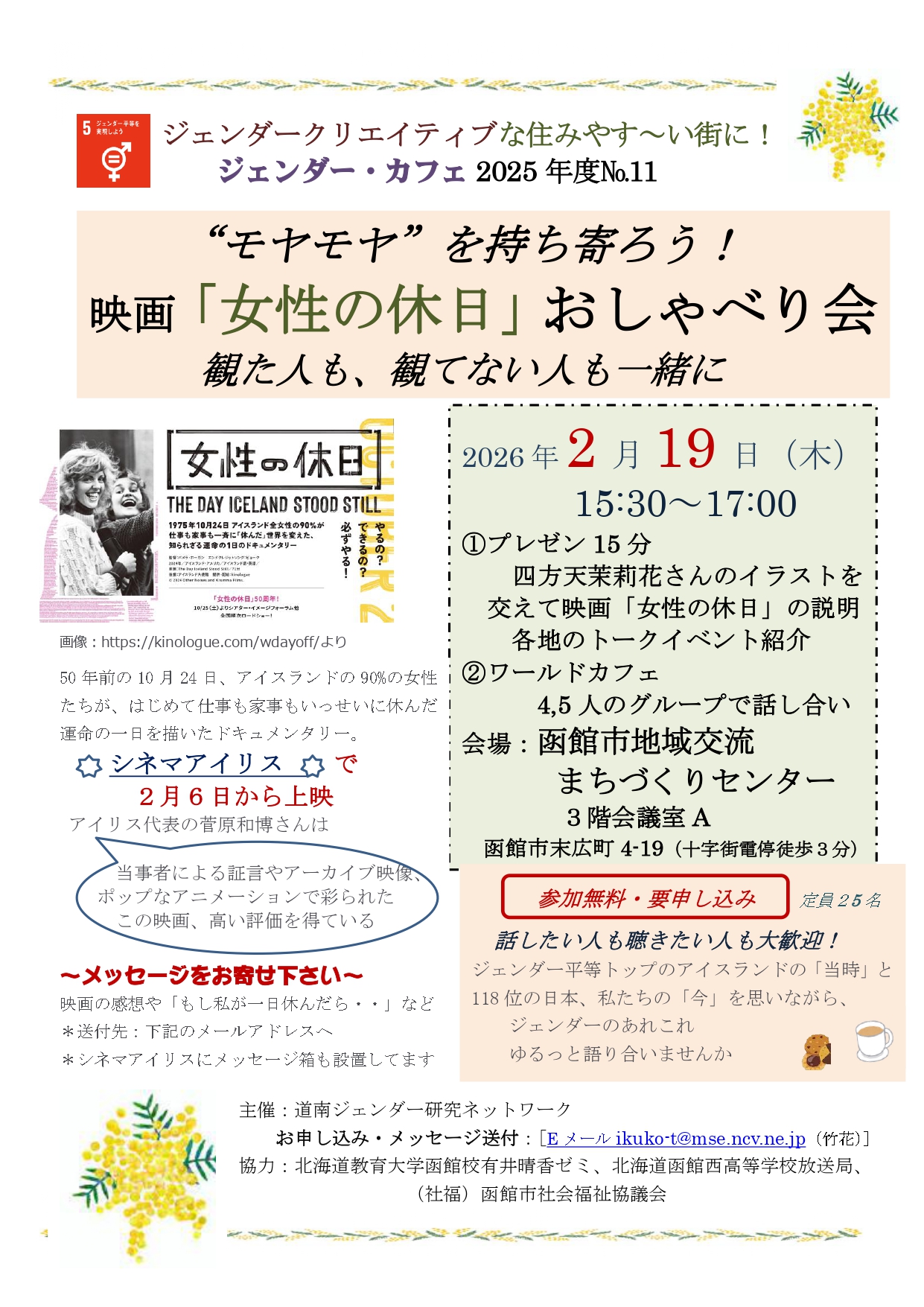 | 詳細: | "モヤモヤ"を持ち寄ろう!映画「女性の休日」おしゃべり会 観た人も、観てない人も 一緒に 日時:2026年2月19日(木)15:30~17:00 会場:函館市地域交流 まちづくりセンター 3階 会議室 A 北海道函館市末広町 4-19 (十字街電停 徒歩3分) プログラム: ① プレゼン15 分 WAN入門塾生 四方天茉莉花さんのイラストを交えて映画 「女性の休日」 の説明 各地のトークイベント紹介 ② ワールドカフェ :4, 5 人のグループで話し合い 参加無料:要申し込み、定員25名 お申し込み・メッセージ送付:Eメール ikuko-t@mse.ncv.ne.jp (竹花) 主催:道南ジェンダー研究ネットワーク 協力:北海道教育大学函館校有井晴香ゼミ、北海道函館西高等学校放送局、(社福)函館市社会福祉協議会 |
