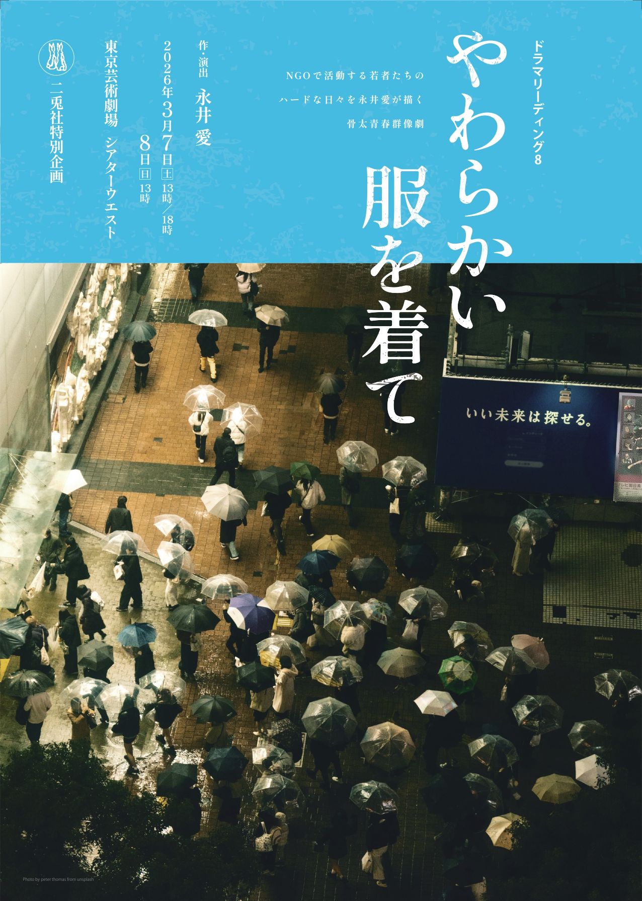 | 詳細: | 2019年に公演した『走り去る人たち』の好評を受けてシリーズ化したドラマリーディング第8弾。俳優たちがワークショップを通してせりふを発するメカニズムを理解・共有し、活発に意見交換しながら活きのいい「永井ワールド」を作り上げます。その成果を「ドラマリーディング」として実際の舞台上で披露します。 今回は2003年のイラク戦争開戦前夜、人道支援に取り組むNGO団体に集う若者たちの行動と挫折を描いた永井愛の青春群像劇に、過去最多の応募者450人の中からオーディションで選ばれた10名の俳優が挑みます。 【公演概要】 ◆タイトル 二兎社特別企画 ドラマリーディング8『やわらかい服を着て』 ◆作・演出 永井 愛 ◆会場 東京芸術劇場 シアターウエスト 〒171-0021 東京都豊島区西池袋1-8-1 03-5391-2111 ◆日時 2026年3月7日(土)13:00/18:00 8日(日)13:00 ※開場は開演の30分前 ※3月7日(土)13:00/18:00は終演後アフタートークあり。 ◆キャスト 蒼井嵐樹 今井公平 丘街ココ 菊池泰生 小比類巻諒介 鈴木あぐり 泰良真由 葉月ひとみ 古谷陸 安田蓮(五十音順) ◆チケット料金 一般3,000円(日時指定・全席自由[整理番号付]・税込) 高校生以下1,000円(枚数限定。要証明書。東京芸術劇場ボックスオフィスのみ取扱) 当日券=開演の45分前より販売 ◆チケット取扱い 二兎社(WEBのみ) 事前クレジット決済、チケット当日引換 https://nitosha.square.site/ 東京芸術劇場ボックスオフィス 0570-010-296(休館日を除く10:00~19:00) https://www.geigeki.jp/ticket/ チケットぴあ セブンイレブン http://w.pia.jp/t/nitosha/ e+(イープラス) ファミリーマート http://eplus.jp/nitosha/ カンフェティ https://confetti-web.com/nitosha 050-3092-0051(平日10:00~17:00) ※オペレーター対応 |