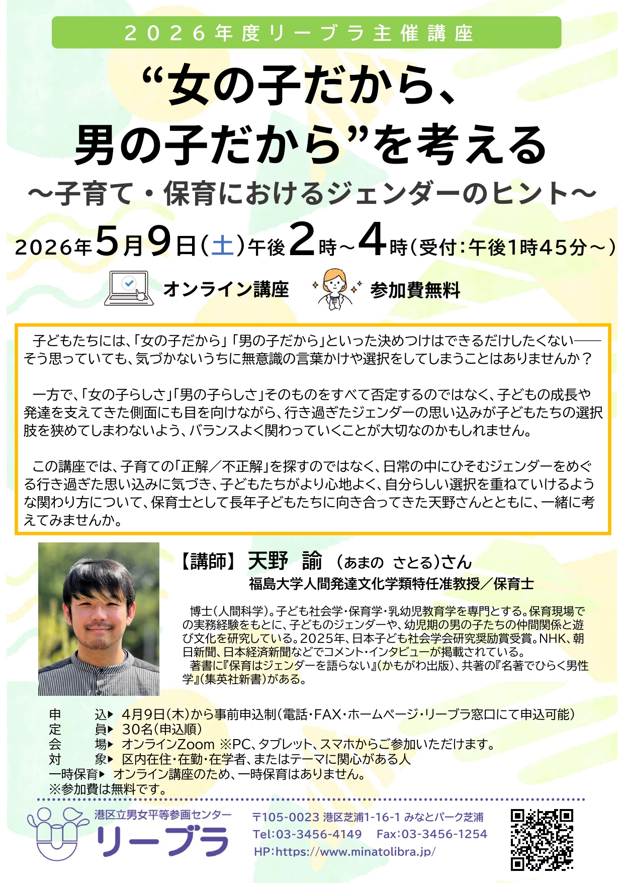 | 詳細: | 港区立男女平等参画センター(愛称:リーブラ)では、2026年5月9日(土)午後2時から主催講座「“女の子だから、 男の子だから”を考える~子育て・保育におけるジェンダーのヒント~」を開催します。参加は無料で、事前申し込み制となっております。下記、詳細となります。 <開催概要> ■講座名称:リーブラ主催講座「“女の子だから、 男の子だから”を考える~子育て・保育におけるジェンダーのヒント~」 ■講座概要: 子どもたちには、「女の子だから」 「男の子だから」といった決めつけはできるだけしたくない――そう思っていても、気づかないうちに無意識の言葉かけや選択をしてしまうことはありませんか? 一方で、「女の子らしさ」「男の子らしさ」そのものをすべて否定するのではなく、子どもの成長や発達を支えてきた側面にも目を向けながら、行き過ぎたジェンダーの思い込みが子どもたちの選択肢を狭めてしまわないよう、バランスよく関わっていくことが大切なのかもしれません。 この講座では、子育ての「正解/不正解」を探すのではなく、日常の中にひそむジェンダーをめぐる行き過ぎた思い込みに気づき、子どもたちがより心地よく、自分らしい選択を重ねていけるような関わり方について、保育士として長年子どもたちに向き合ってきた天野さんとともに、一緒に考えてみませんか。 ■講師:天野 諭 (あまの・さとる)さん 福島大学人間発達文化学類特任准教授/博士(人間科学)/保育士 子ども社会学・保育学・乳幼児教育学を専門とする。実務経験をもとに子どものジェンダーに関心を寄せ、保育園でのビジュアル・エスノグラフィー調査を通じて、「戦いごっこ」などを手がかりに幼児期の男の子たちの仲間関係と遊び文化を研究している。2025年、日本子ども社会学会研究奨励賞受賞。NHK、朝日新聞、日本経済新聞などでインタビュー・コメントが掲載されている。 著書に『保育はジェンダーを語らない』(かもがわ出版)、共著に『名著でひらく男性学──〈男〉のこれからを考える』(共著:杉田 俊介・西井 開・川口 遼・天野 諭/集英社新書)がある。 ■日程:2026年5月9日(土)午後2時~4時(開場:午後1時45分~) ■会場:オンライン開催(zoom) ■費用・定員:無料(事前申し込み制)・30名(申し込み順) ■対象:区内在住・在勤・在学者またはテーマに関心がある人。 ■申込:申込フォーム(https://www.minatolibra.jp/event/apply_on-line/?post_id=17117)からお申込みください。 ぜひこの機会にジェンダー平等、男女平等参画社会についての意識・知識を高めていただければ幸いです。 |