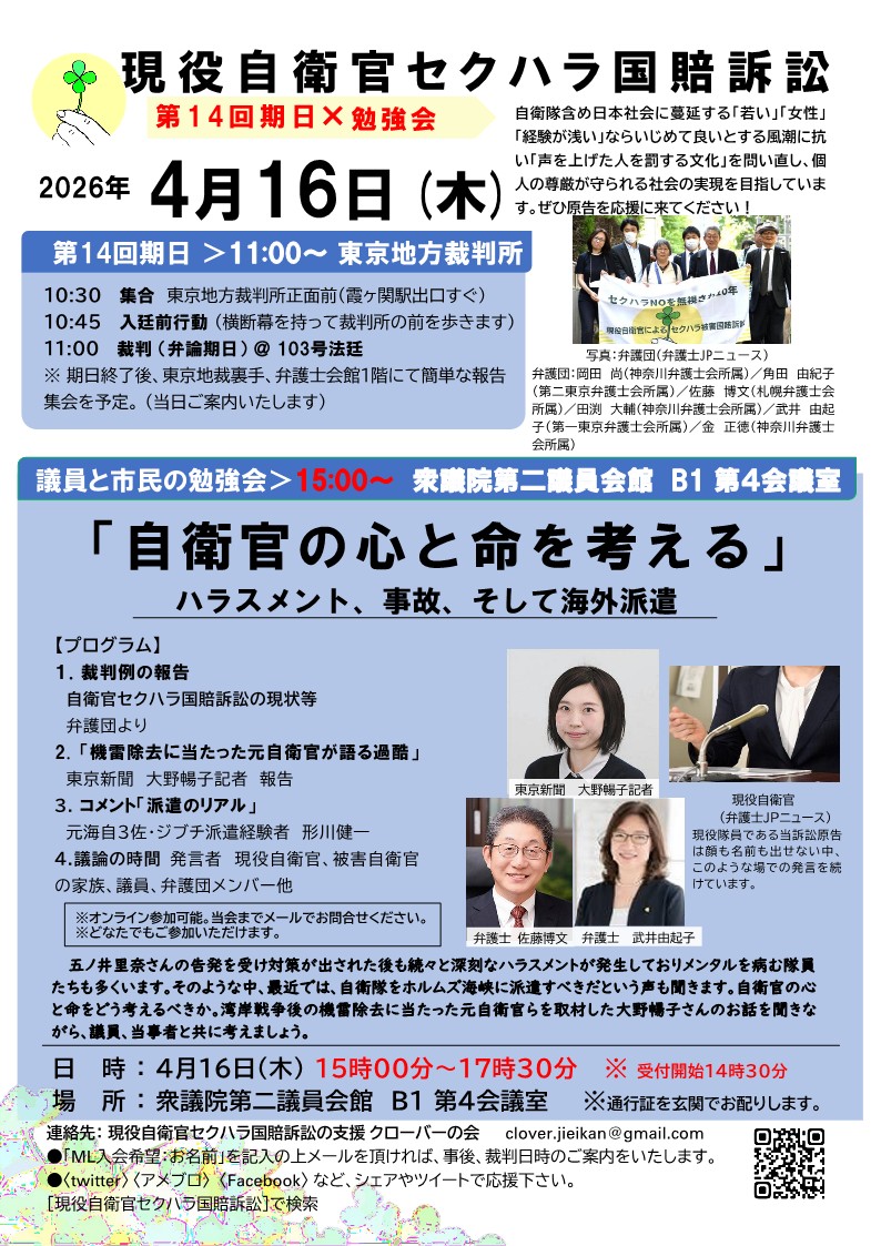 | 詳細: | 現役自衛官セクハラ国賠訴訟第14回弁論期日(2026/04/16) 傍聴のお願いと勉強会のお知らせ 情報拡散、転送大歓迎です。今回の期日では久保田茉莉先生の軍隊の男女共同参画の観点で、原告に起こったことを分析します。また、蟻塚亮二先生による意見書の補充も致します。 傍聴で、勉強会参加で、また情報拡散で、原告をぜひ応援してください。 ◆2026年4月16日(木)現役自衛官セクハラ国賠訴訟第 第14回弁論期日× 勉強会◆ 【第14回弁論期日 > 11:00~ 東京地方裁判所】 10:30 集合 東京地方裁判所(東京高裁/地裁/簡裁合同庁舎)正面前(霞ヶ関駅出口すぐ。) 10:45 入廷前行動 (横断幕を持って裁判所の前を歩きます) 11:00 裁判(弁論期日)103号法廷にて ※期日終了後、東京地裁裏手、弁護士会館1階にて簡単な報告集会を予定(当日ご案内いたします)。 【議員と市民の勉強会 > 15:00~ 衆議院第二議員会館 地下1階 第4会議室】 「自衛官の心と命を考える」――ハラスメント、事故、そして海外派遣―― 15:00~17:30(※受付開始14:30。通行証を衆議院第二議員会館の一階玄関でお配りします。) 五ノ井里奈さんの告発を受け対策が出された後も続々と深刻なハラスメントが発生しておりメンタルを病む隊員たちも多くいます。そのような中、最近では、自衛隊をホルムズ海峡に派遣すべきだという声も聞きます。自衛官の心と命をどう考えるべきか。湾岸戦争後の機雷除去に当たった元自衛官らを取材した東京新聞・大野暢子さんのお話を聞きながら、議員、当事者と共に考えましょう。 ・プログラム 1.裁判例の報告 自衛官セクハラ国賠訴訟の現状等 弁護団より 2.「機雷除去に当たった元自衛官が語る過酷」 東京新聞 大野暢子記者 報告 3.コメント「派遣のリアル」 元海自3佐・ジブチ派遣経験者 形川健一 4.議論の時間 発言者 現役自衛官、被害自衛官の家族、議員、弁護団メンバー他 ※勉強会は、オンライン参加可能です。当会までメール(clover.jieikan@gmail.com)でお問合せください。 ※会場参加・オンライン参加とも、どなたでもご参加いただけます。 自衛隊含め日本社会に蔓延する「若い」「女性」「経験が浅い」ならいじめて良いとする風潮に抗い「声を上げた人を罰する文化」を問い直し、個人の尊厳が守られる社会の実現を目指しています。ぜひ原告を応援に来てください。 弁護団:岡田 尚(神奈川弁護士会所属)/角田 由紀子(第二東京弁護士会所属)/佐藤 博文(札幌弁護士会 所属)/田渕 大輔(神奈川弁護士会所属)/武井 由起子(第一東京弁護士会所属)/金 正徳(神奈川弁護士会所属) 連絡先: 現役自衛官セクハラ国賠訴訟の支援 クローバーの会 clover.jieikan@gmail.com ・「ML入会希望:お名前」を記入の上メールを頂ければ、事後、裁判日時のご案内をいたします。 ・〈X〉〈アメブロ〉〈Facebook〉など、シェアやツイートで応援下さい(「現役自衛官セクハラ国賠訴訟」で検索してください) |