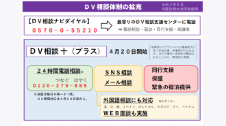 新型コロナの影響でドメスティック・バイオレンスが増加している問題に関連して、 DVに関する相談体制を拡充し、従来設けられていた電話窓口(「DV相談ナビ」0570-0-55210)に加え、 24時間態勢で電話(0120−279−889) や