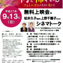 ★ 石川試写会日時 2015年4月17日(金)会場 金沢市近江町交流プラザ 参加者数 34人主催 石川おんなのスペース後半の20分ほどで桜井陽子さんと広岡立美のミニトークを開催した。実際に桜井さんにお会いし、直接お話をお聞きすることで「フェミニズムって日常生活の中のことなのだ」と思われたようである。より身近に感じることができたとのことであ…