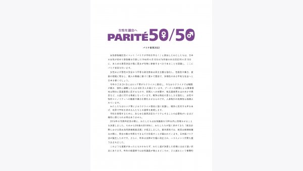On April 10, 2016, an event was held to commemorate the 70th anniversary of women's suffrage in Japan. The "Declaration on Double the Number of Women Legislators " adopted during that event gave rise to the "Parité Declaration," a statement of resolution that is adopted annually at the commemorative event organized by the Parité Campaign Executive Committee. The declaration reaffirms our commitment each year leading up to the 80th anniversary in