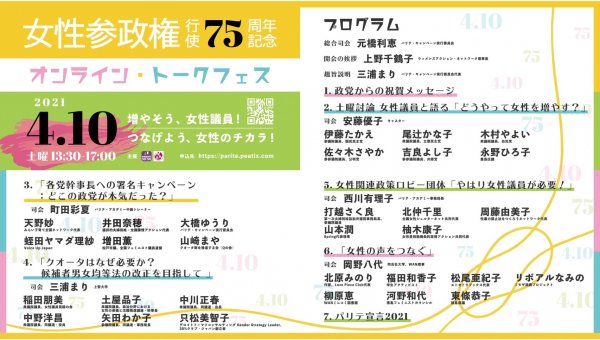Am 10. April 2016 fand eine Veranstaltung zum Gedenken an den 70. Jahrestag der Einführung des Frauenwahlrechts in Japan statt. Seit der damals verabschiedeten "Erklärung zur Verdoppelung der Zahl der weiblichen Abgeordneten" wird bei den alljährlichen Gedenkveranstaltungen ein "Manifest zur Geschlechterparität" verabschiedet. Auf dem Weg zum 80. Jahrestag im Jahr 2026 verpflichten wir uns, den Kreis der Mitstreitenden, die sich für die Erhöh